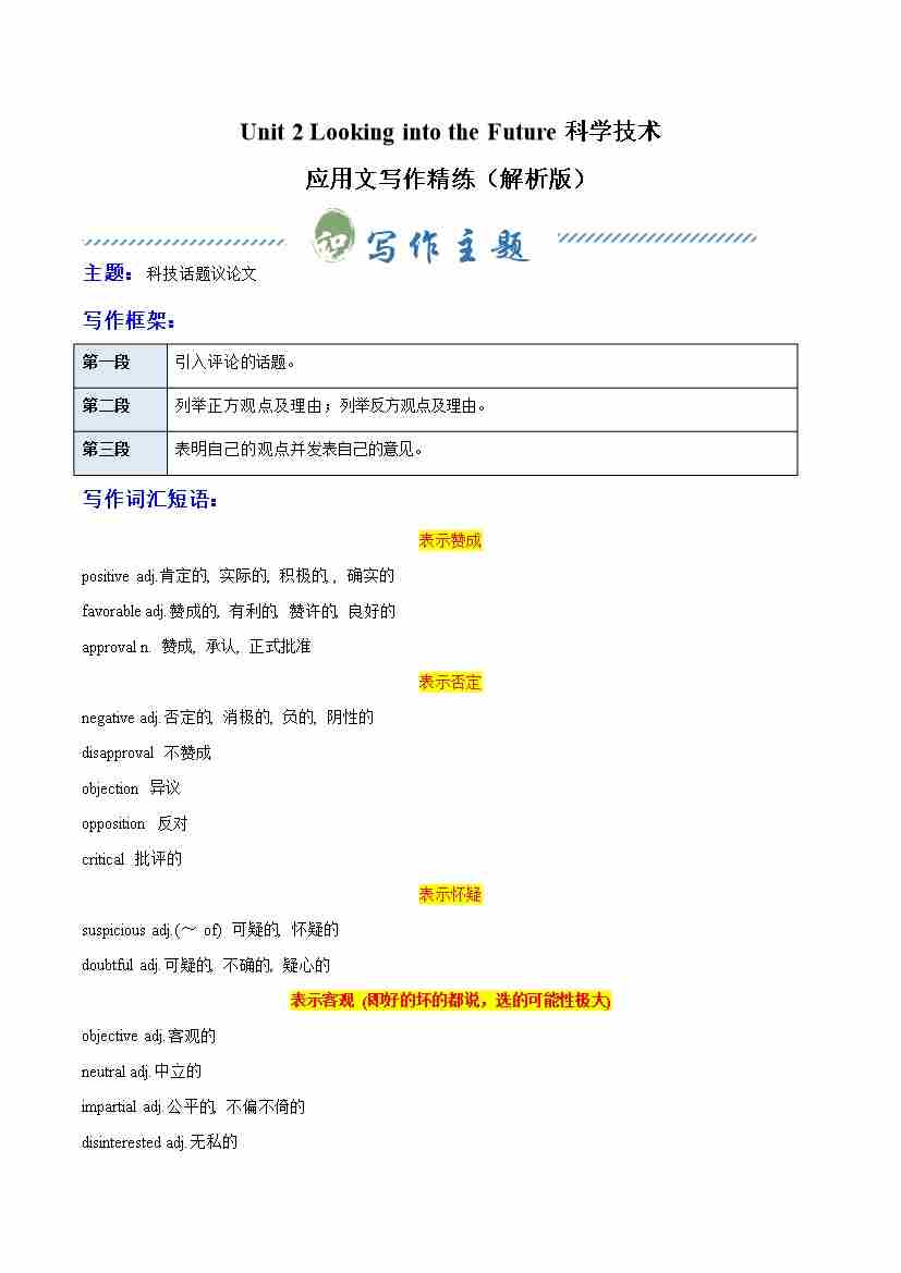 Unit 2 Looking into the Future科学技术(单元议论文写作精练)(教师版)
