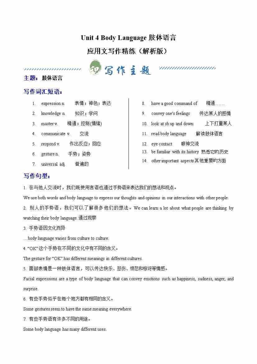 Unit 4 Body Language肢体语言(单元应用文写作精练)(学生版)
