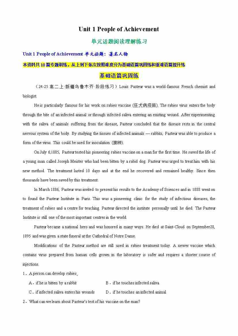 Unit 1 People of Achievement 单元话题阅读理解练习(学生版)
