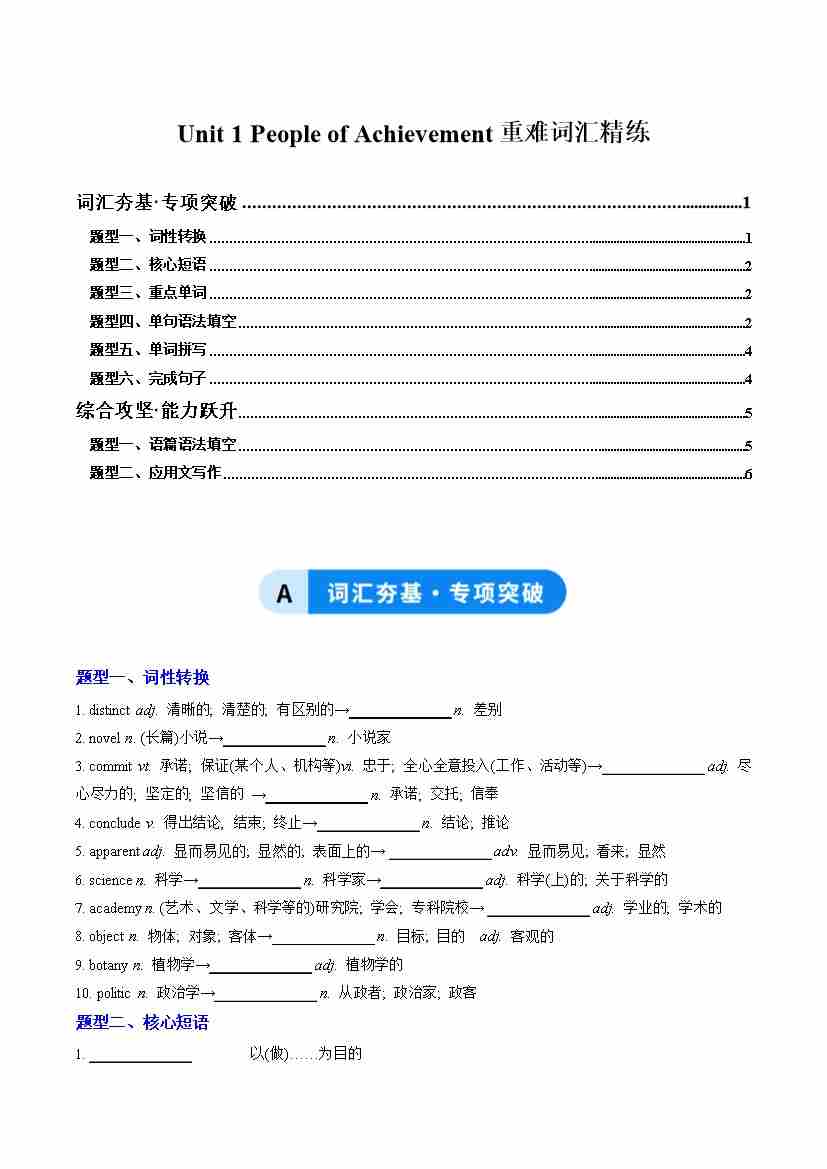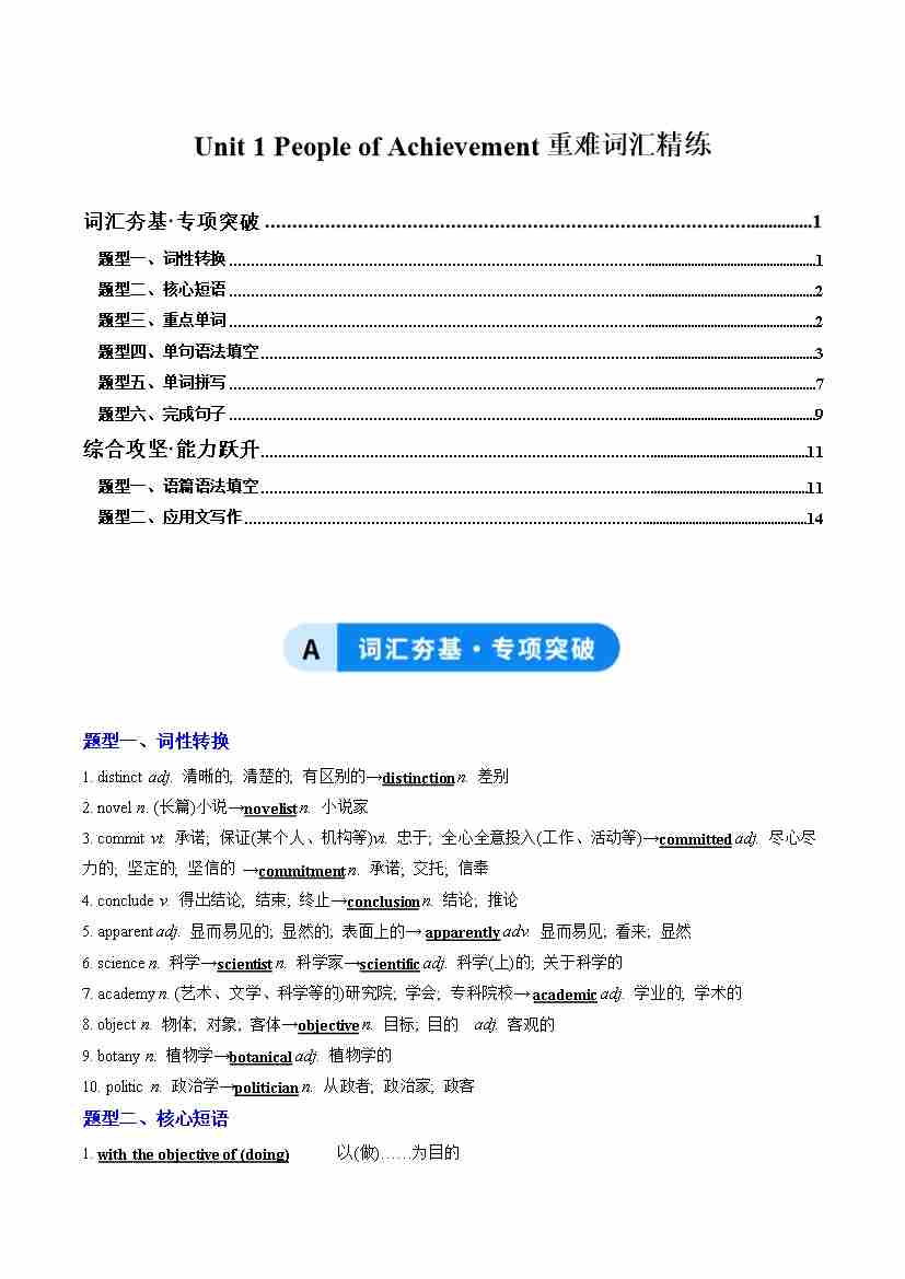 Unit 1 People of Achievement(重难词汇精练)(学生版)