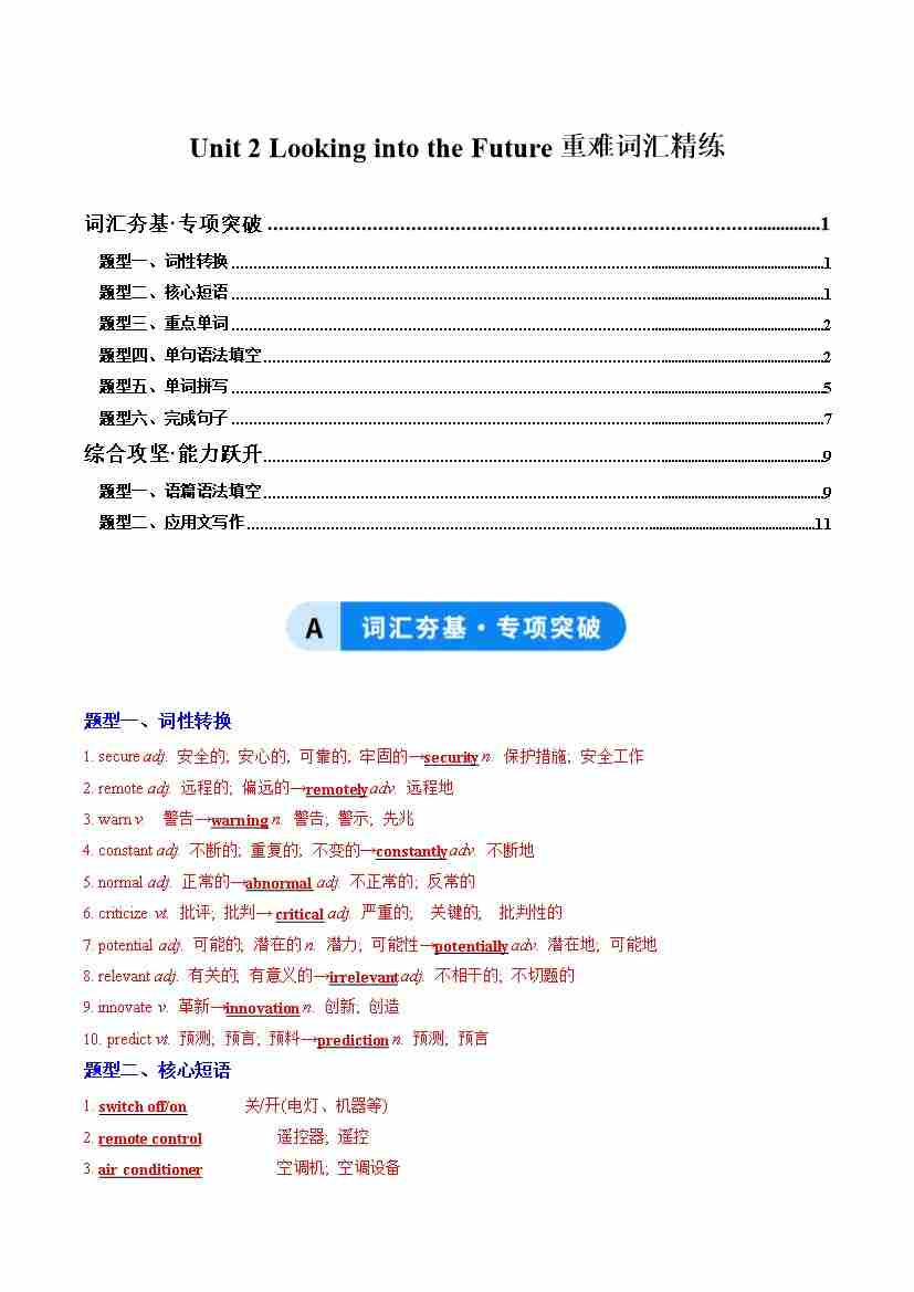 Unit 2 Looking into the Future(重难词汇精练)(教师版)