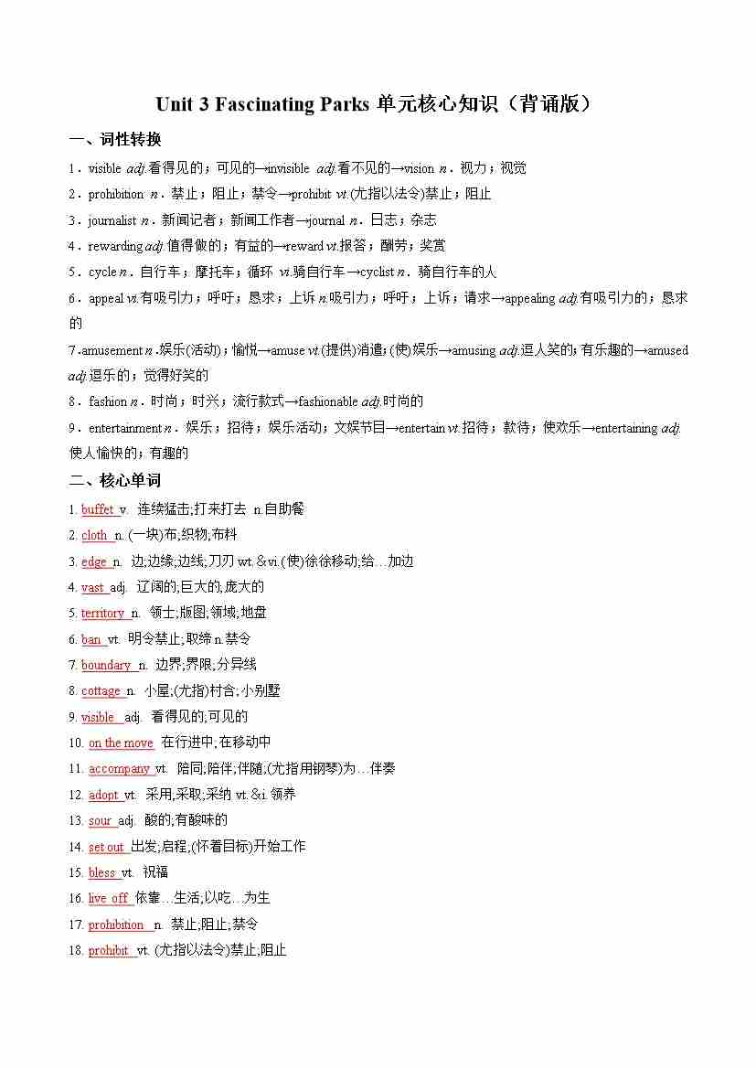 Unit 3 Fascinating Parks(单元核心知识)(背诵版)