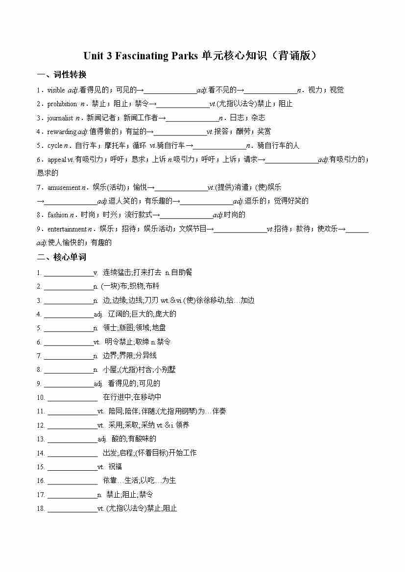 Unit 3 Fascinating Parks(单元核心知识)(默写版)