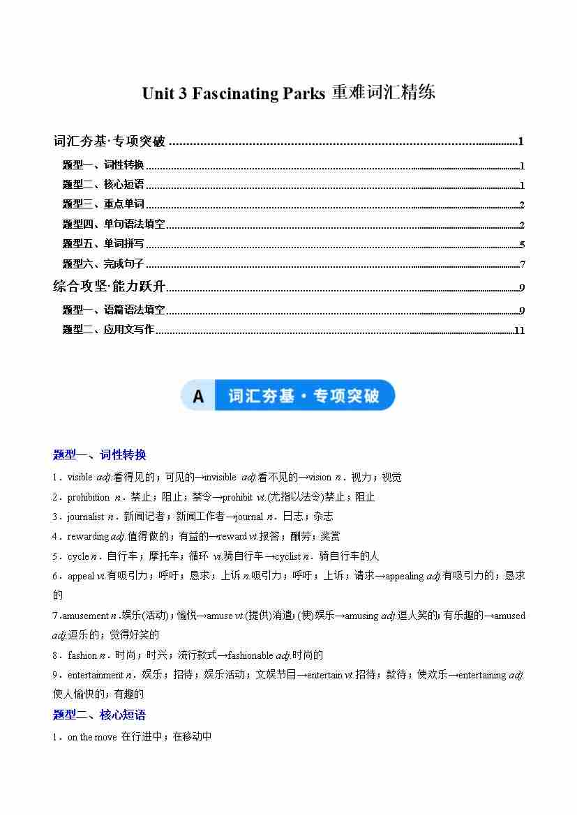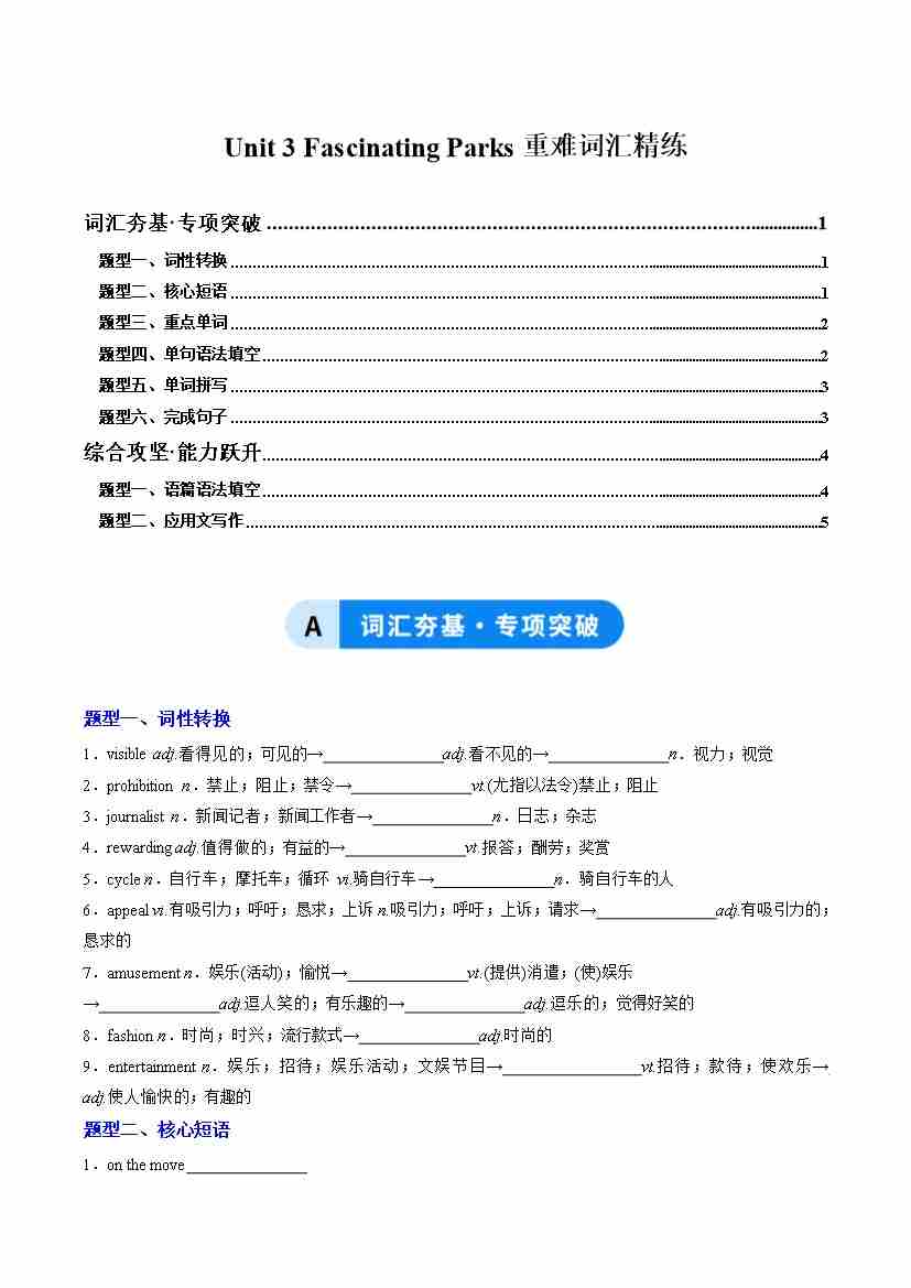 Unit 3 Fascinating Parks(重难词汇精练)(学生版)