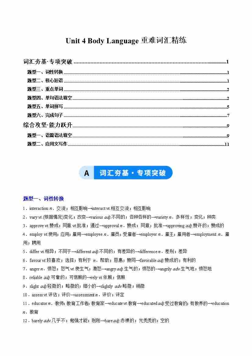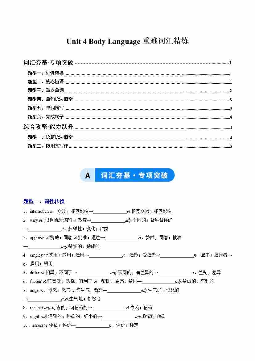 Unit 4 Body Language(重难词汇精练)(学生版)