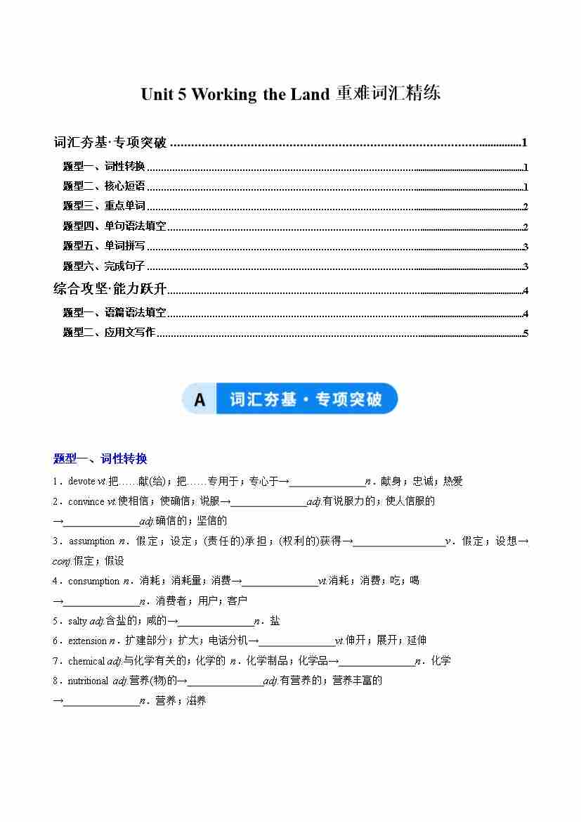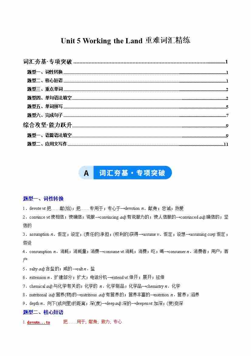 Unit 5 Working the Land(重难词汇精练)(教师版)