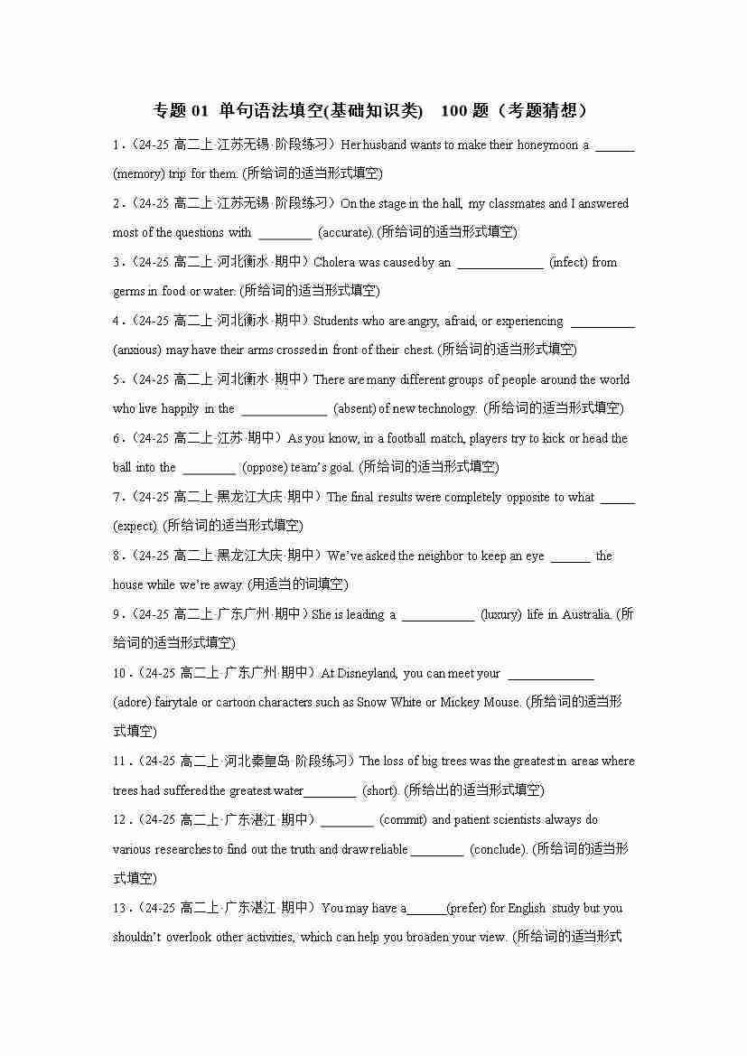 专题01 单句语法填空(基础知识类) 100题(考题猜想)(学生版)