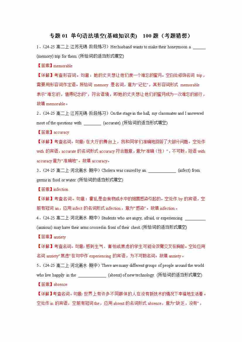 专题01 单句语法填空(基础知识类) 100题(考题猜想)(教师版)