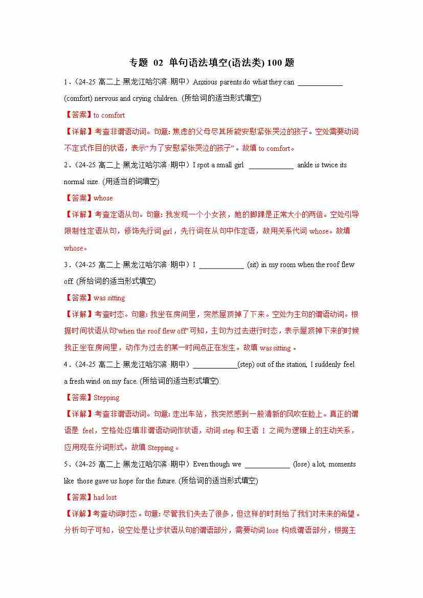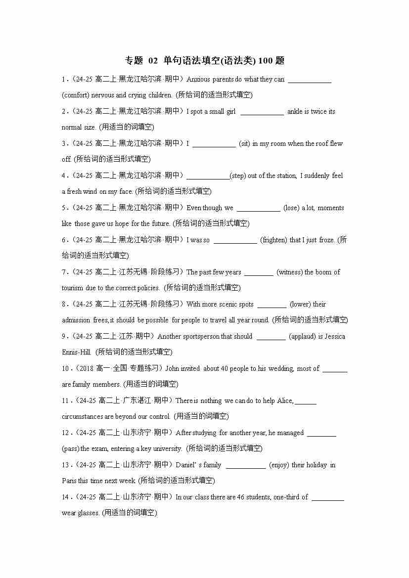 专题02 单句语法填空(语法类) 100题(考题猜想)(教师版)