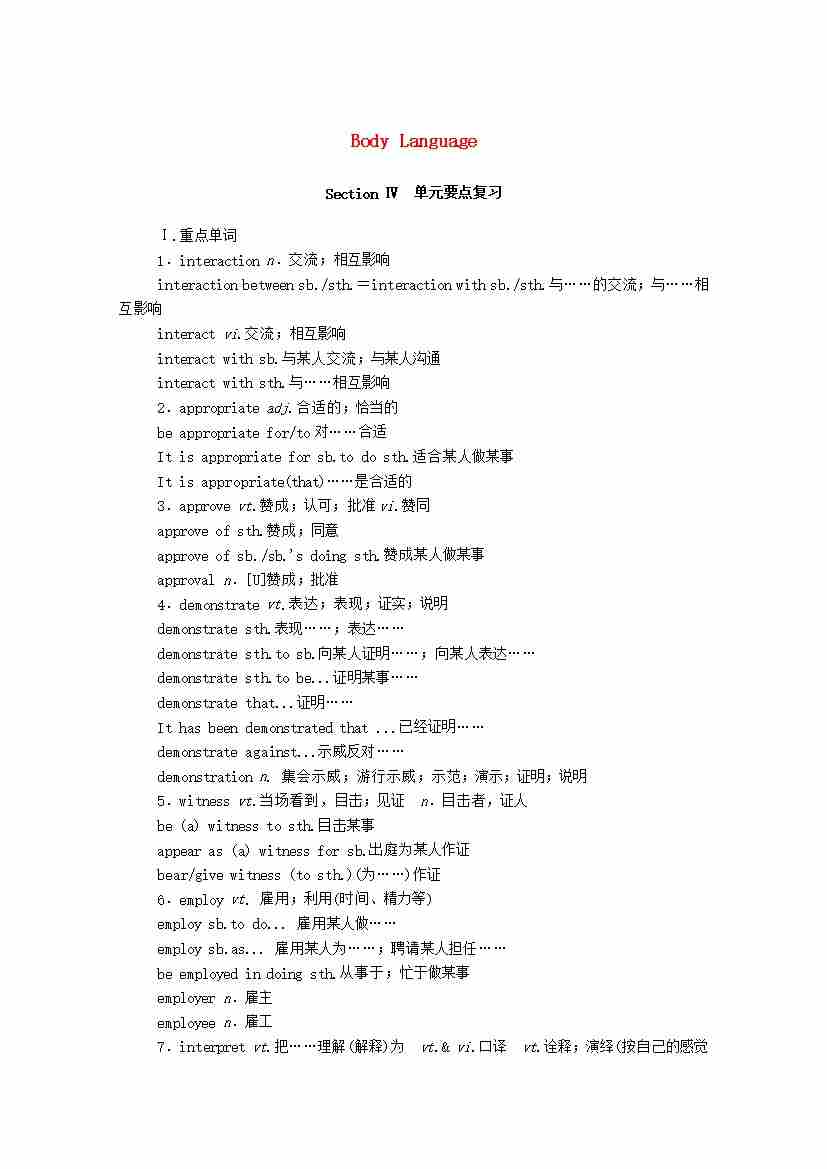 新教材高中英语Unit4BodyLanguageSectionⅣ单元要点复习含解析新人教版选择性必修第一册