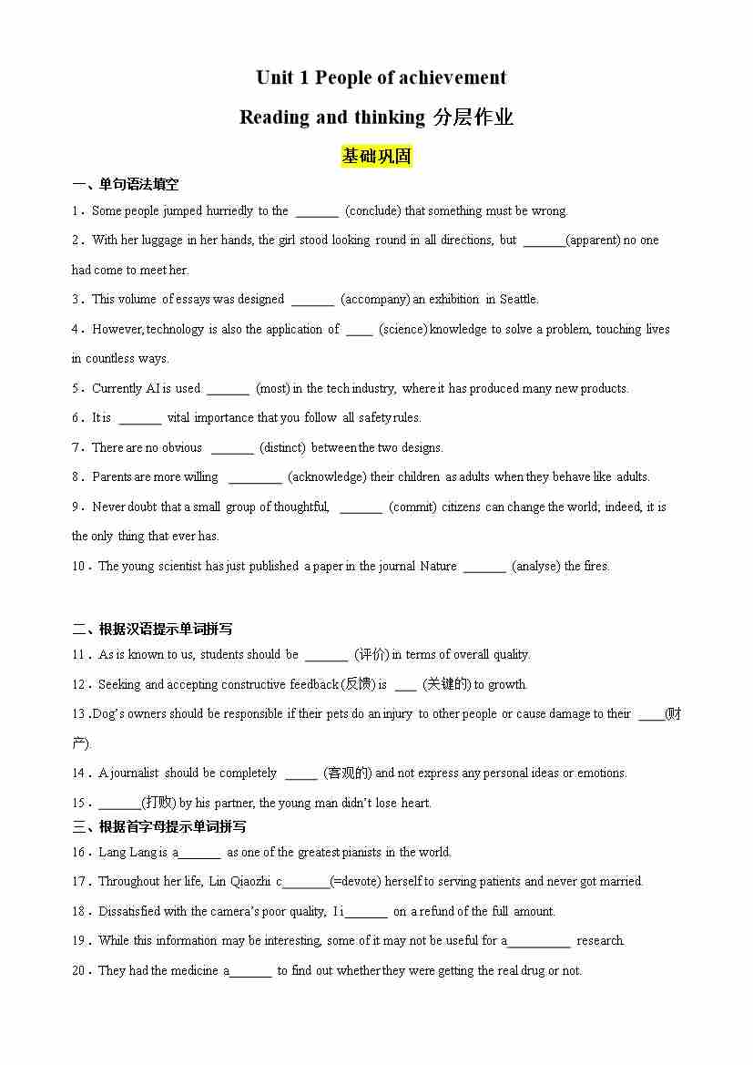 Unit 1 People of achievement Reading and thinking分层作业(原卷版)