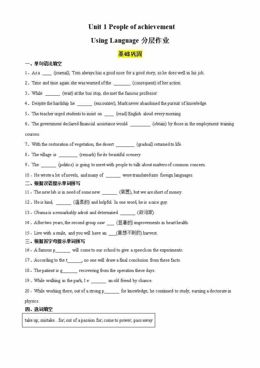 Unit 1 People of achievement Using Language分层作业(原卷版)
