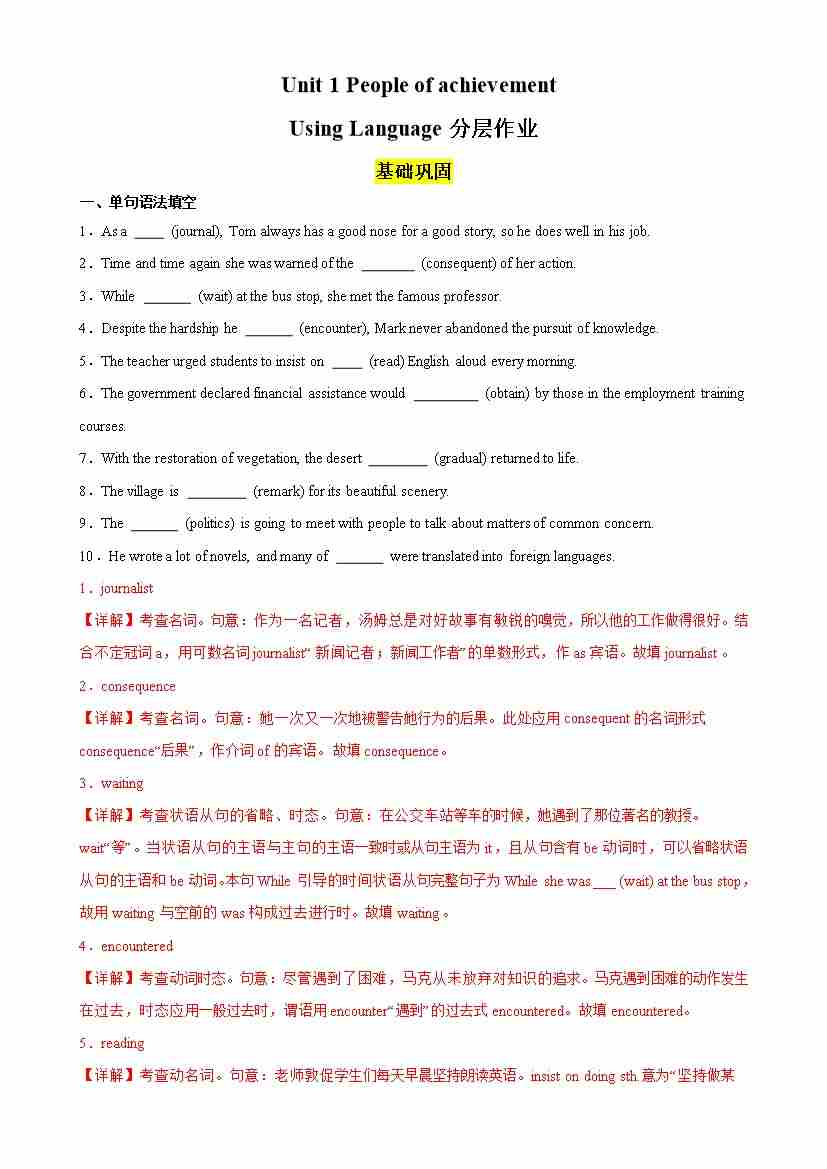 Unit 1 People of achievement Using Language分层作业(解析版)