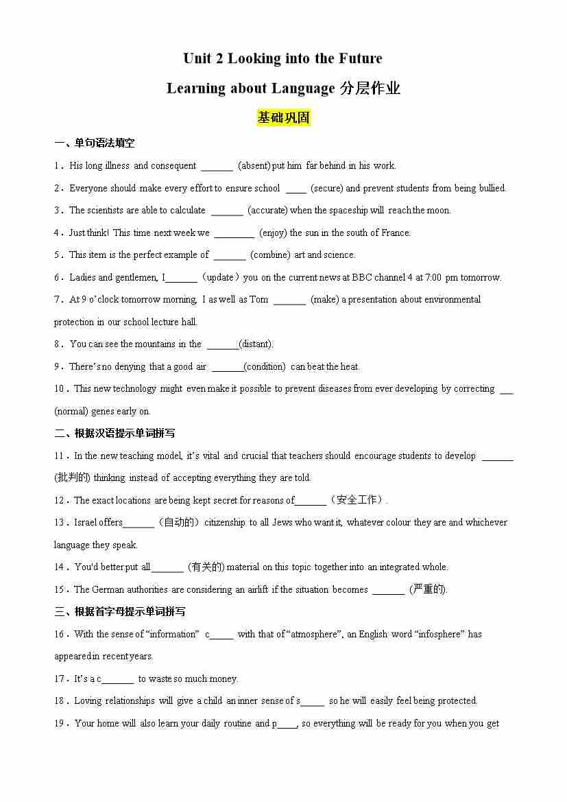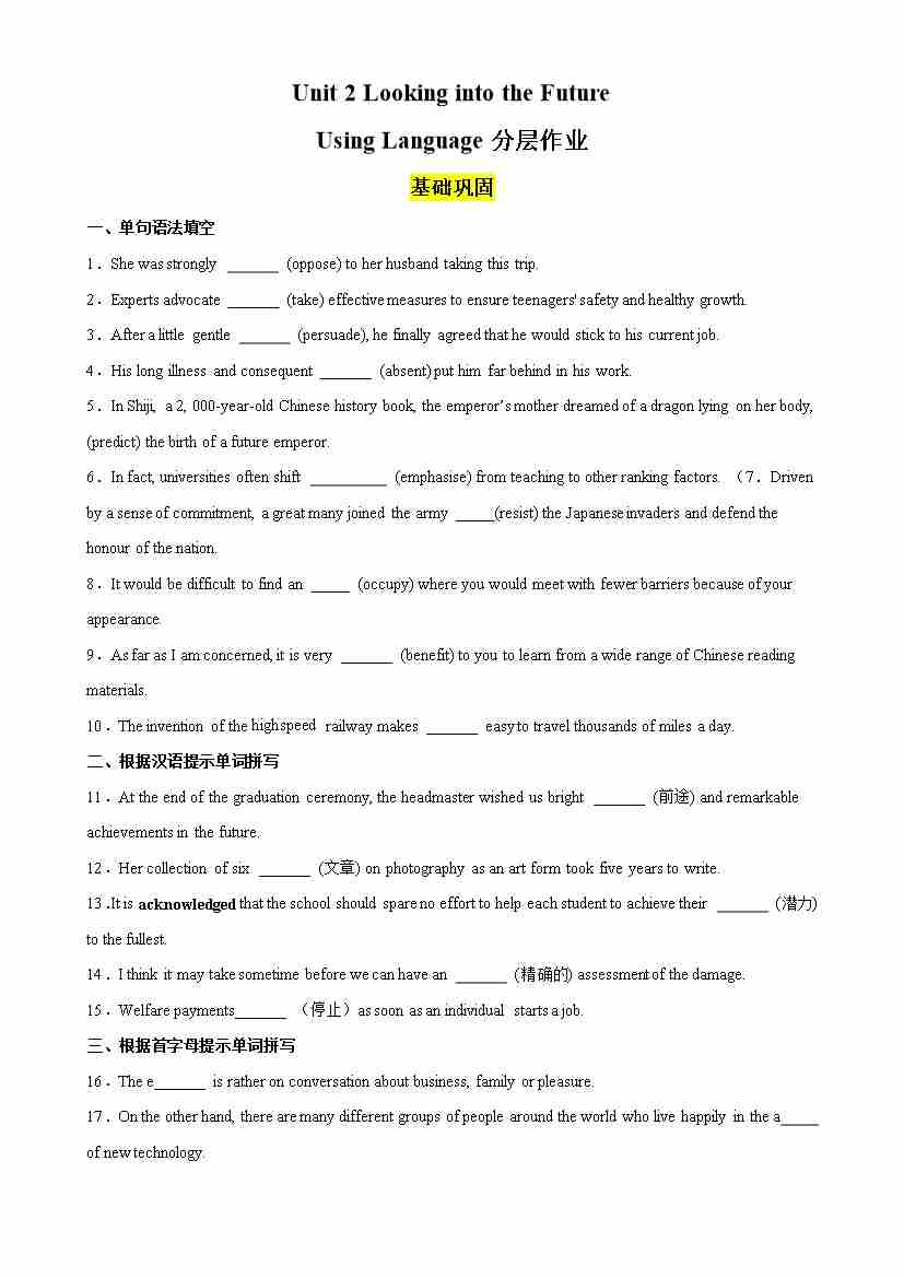 Unit 2 Looking into the Future Using Language分层作业(原卷版)