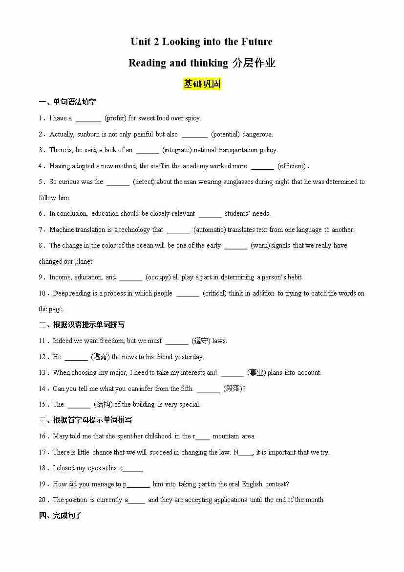 Unit 2 Looking into the Future Reading and thinking分层作业(解析版)