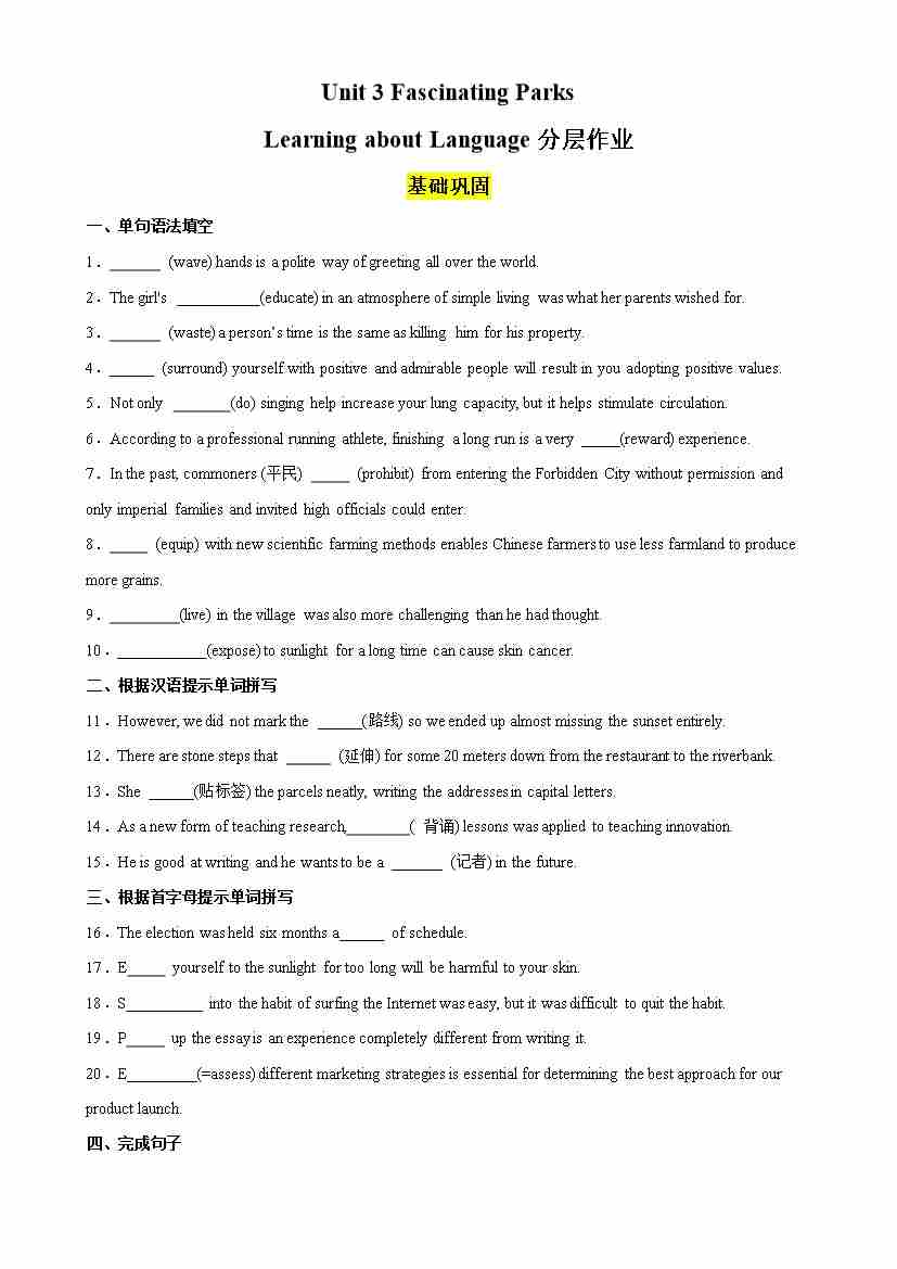 Unit 3 Fascinating Parks Learning about Language分层作业(原卷版)