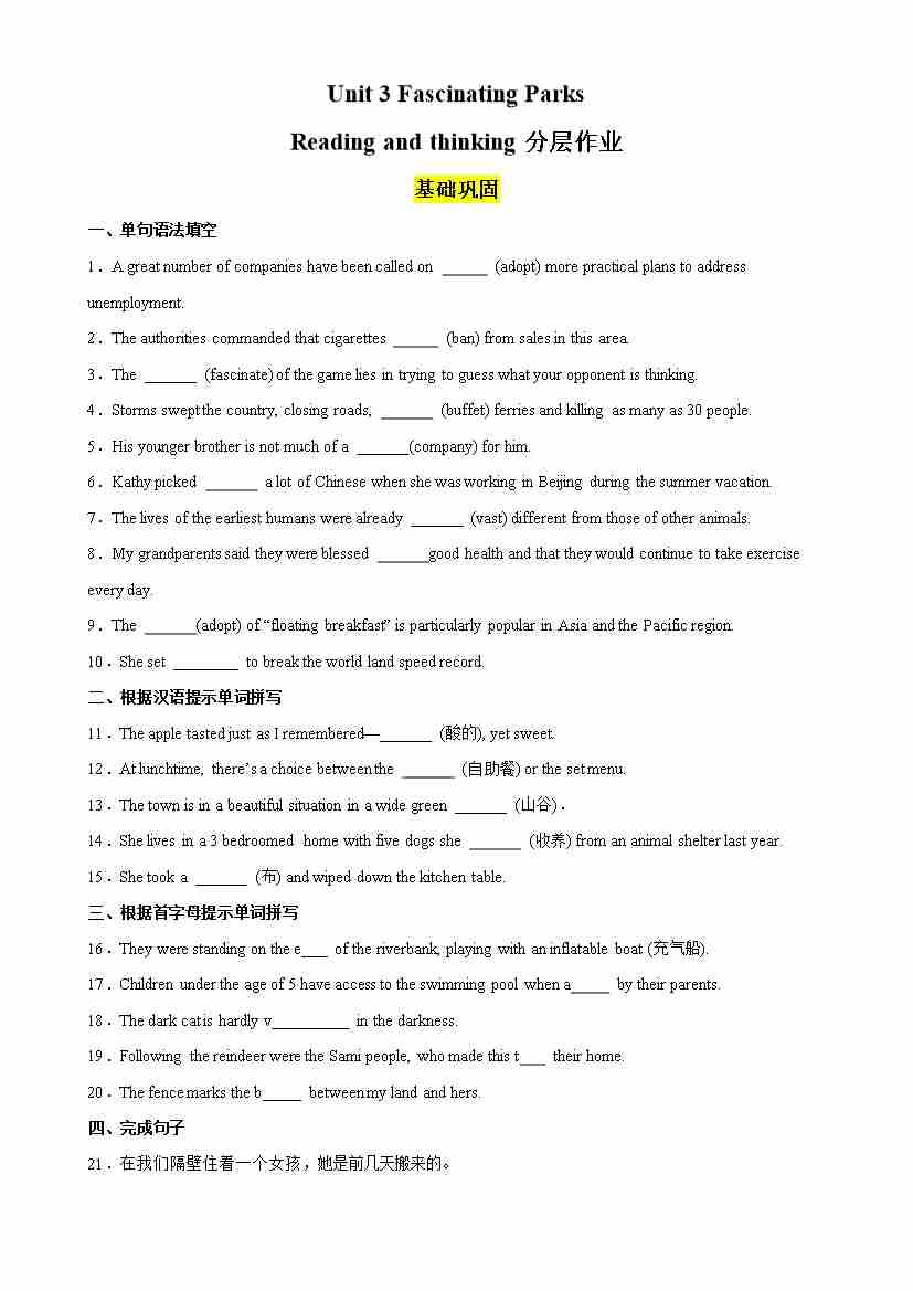 Unit 3 Fascinating Parks Reading and thinking分层作业(原卷版)