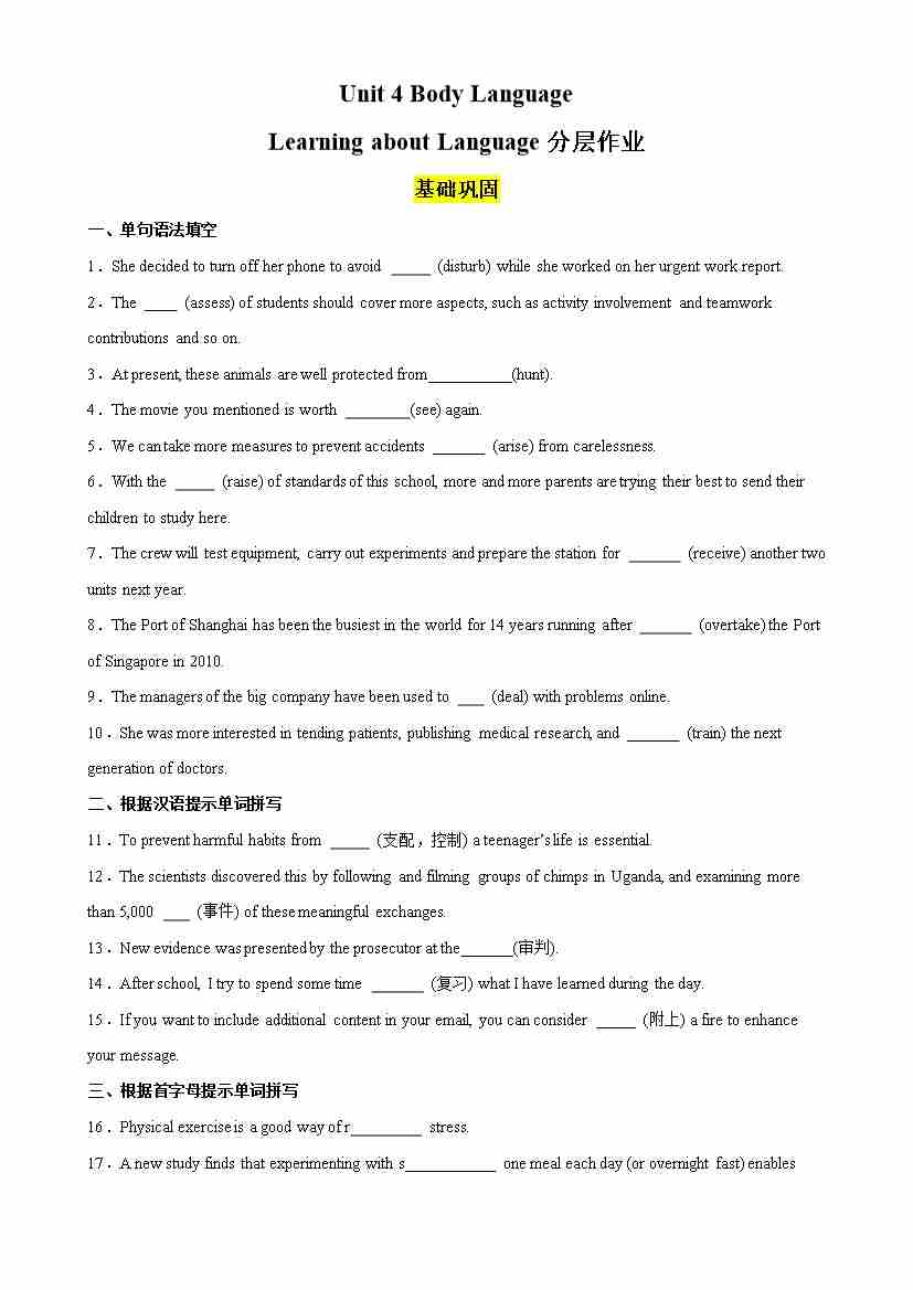 Unit 4 Body Language Learning about Language分层作业(原卷版)