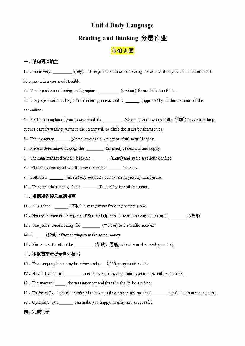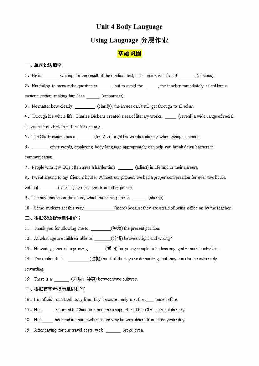 Unit 4 Body Language Using Language分层作业(解析版)