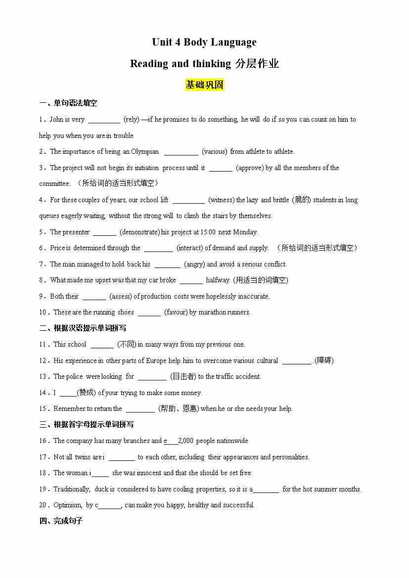 Unit 4 Body Language Reading and thinking分层作业(解析版)