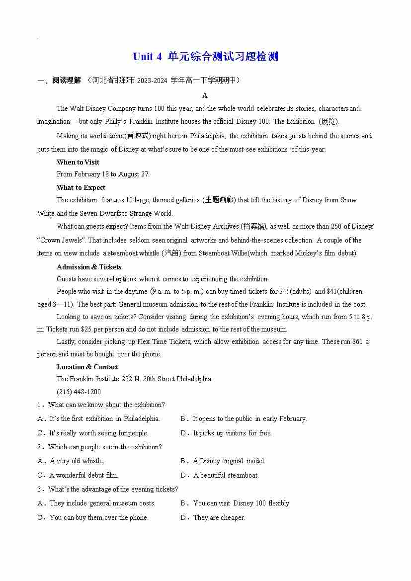 Unit 4 单元综合测试习题检测(解析版)--- 【上好课】2024-2025学年高一英语同步精品课堂(人教版2019必修第三册)