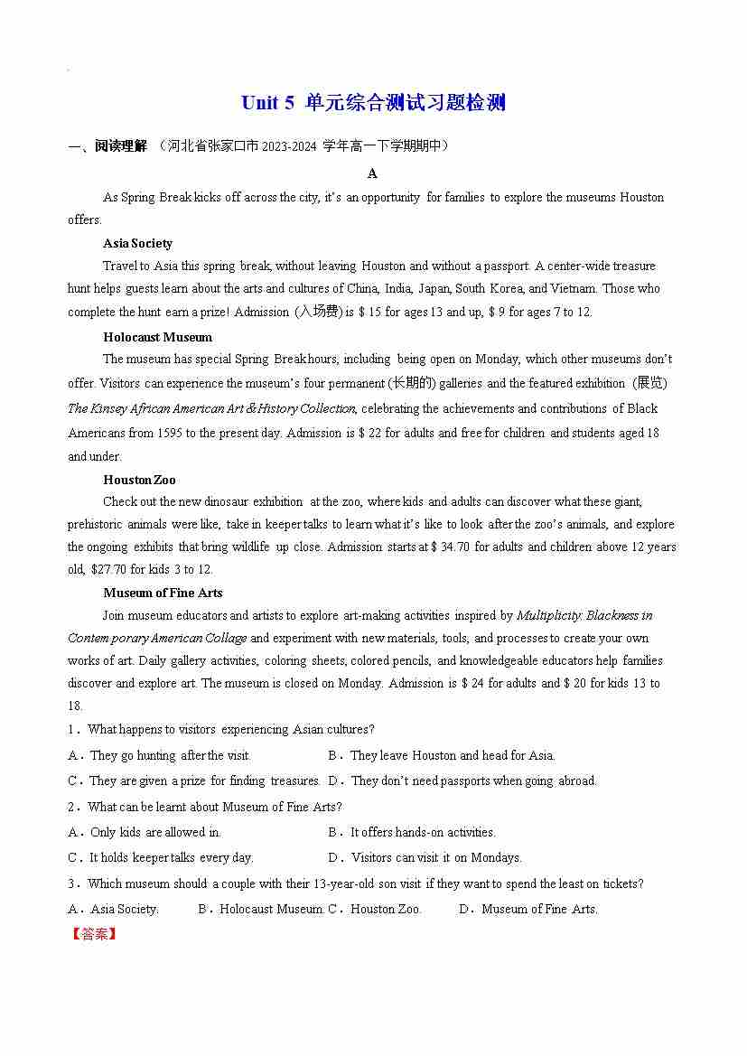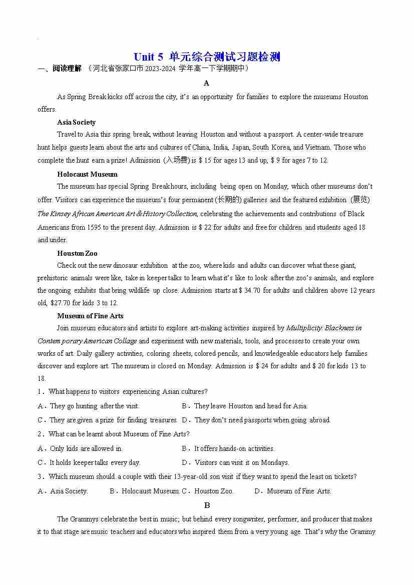 Unit 5 单元综合测试习题检测(原卷版)--- 【上好课】2024-2025学年高一英语同步精品课堂(人教版2019必修第三册)