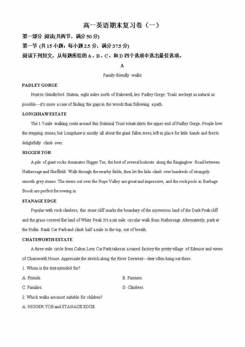 高一下学期期末复习卷(一) 英语试题(原卷版)