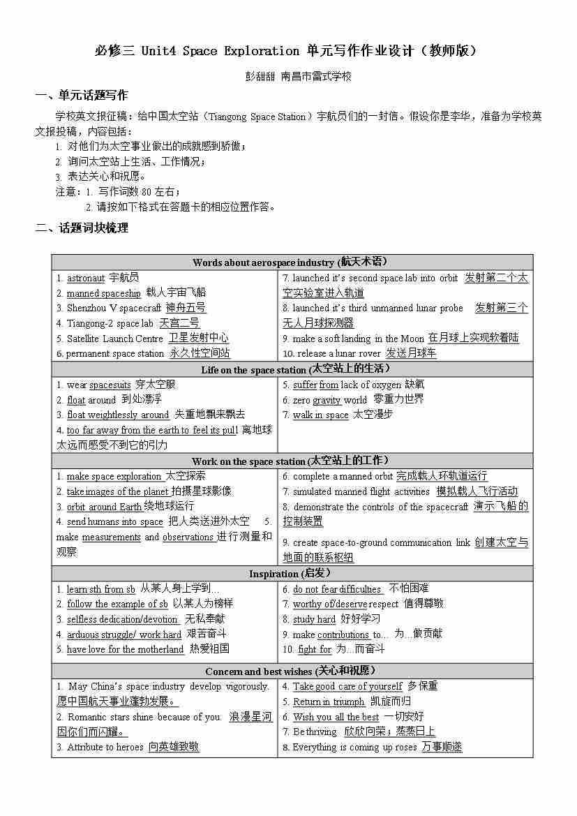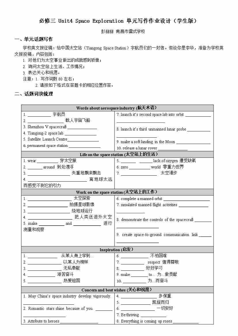必修三 Unit4 Space Exploration 单元写作作业设计(教师版)