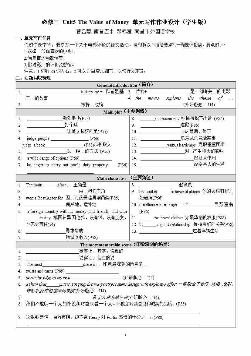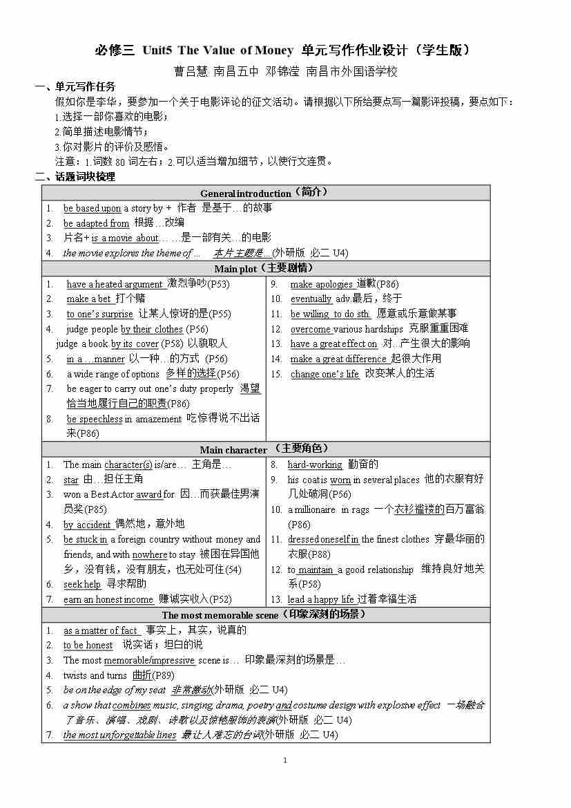 必修三 Unit5 The Value of Money 单元写作作业设计(学生版)