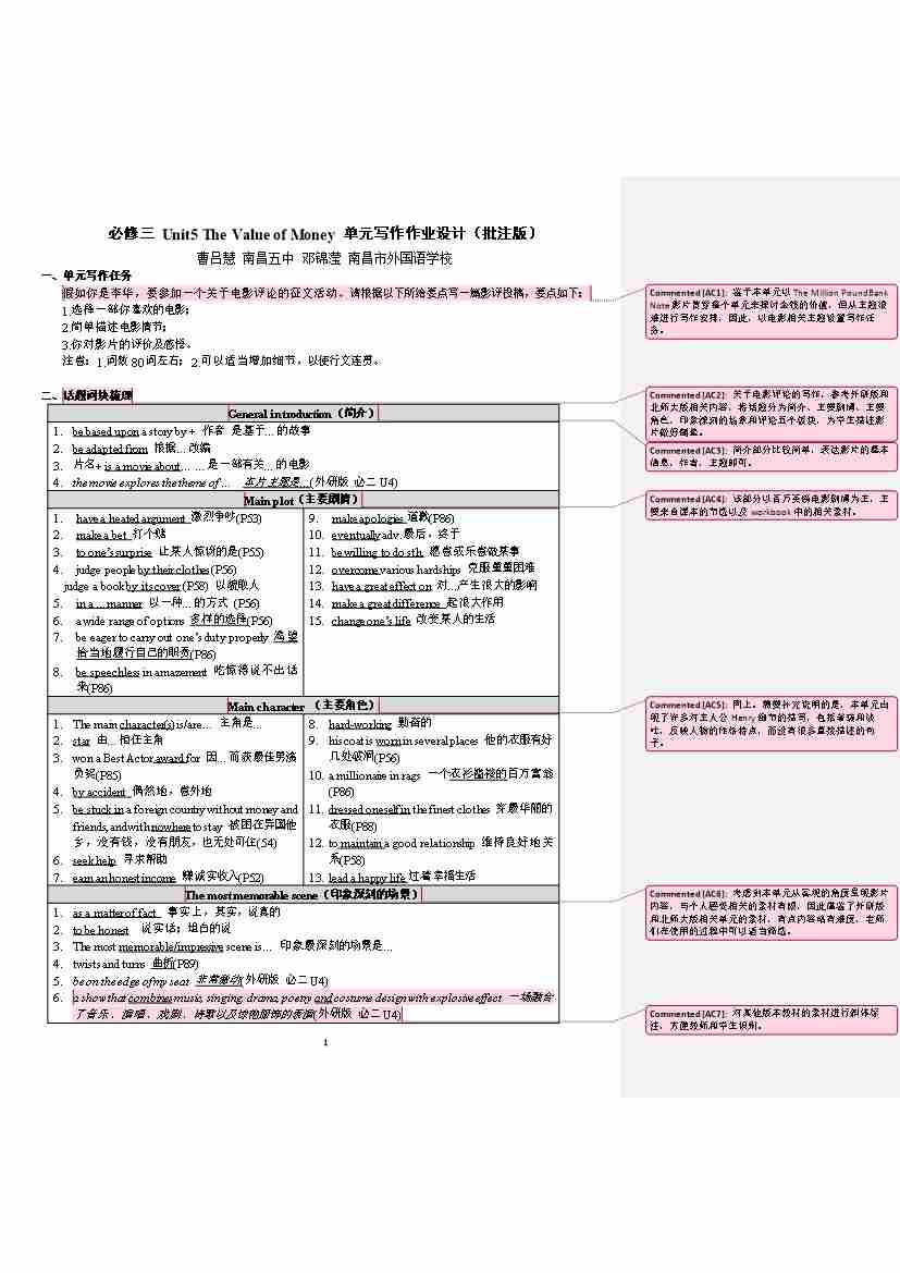 必修三 Unit5 The Value of Money 单元写作作业设计(批注版)