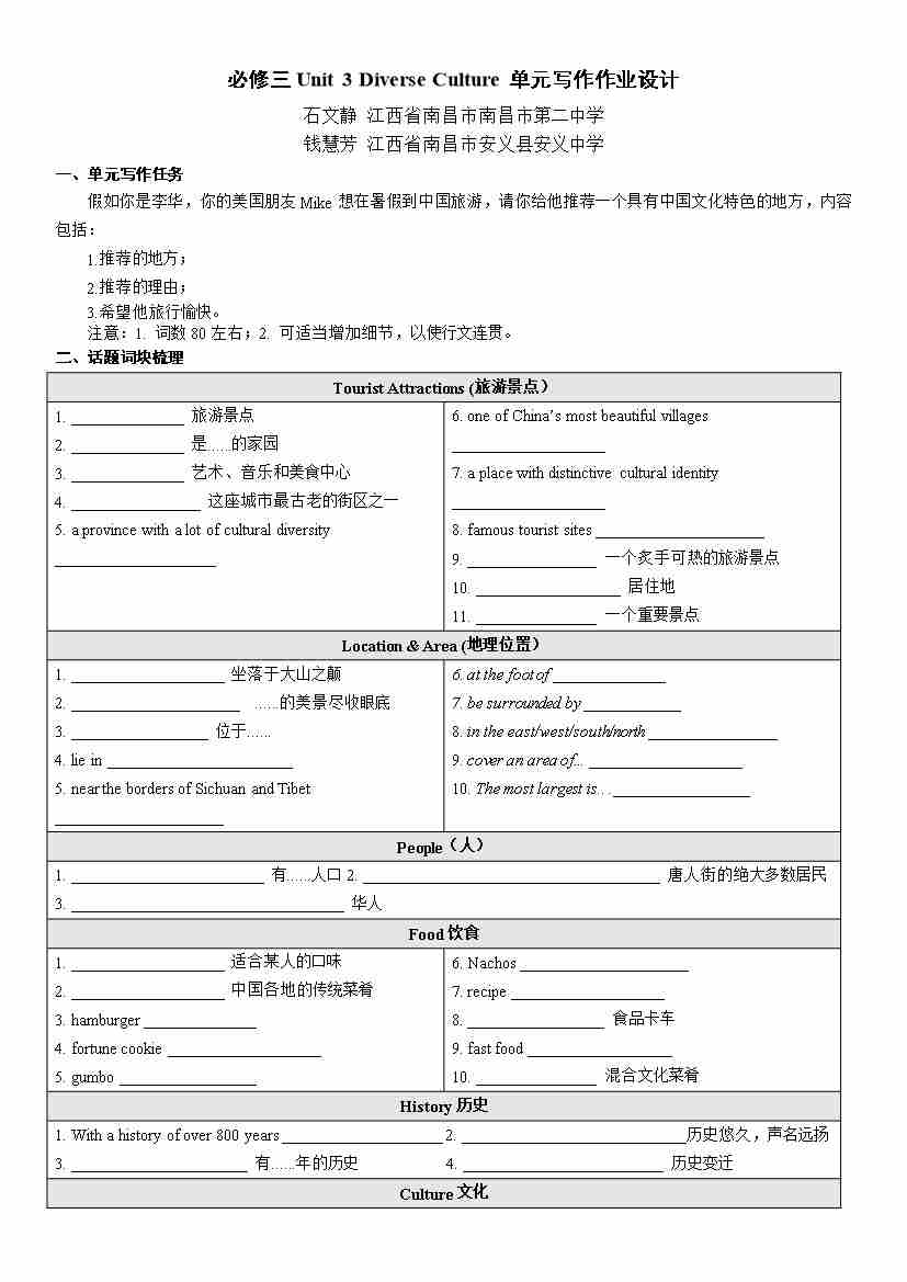 必修三Unit 3 Diverse Culture单元写作作业设计(学生版)