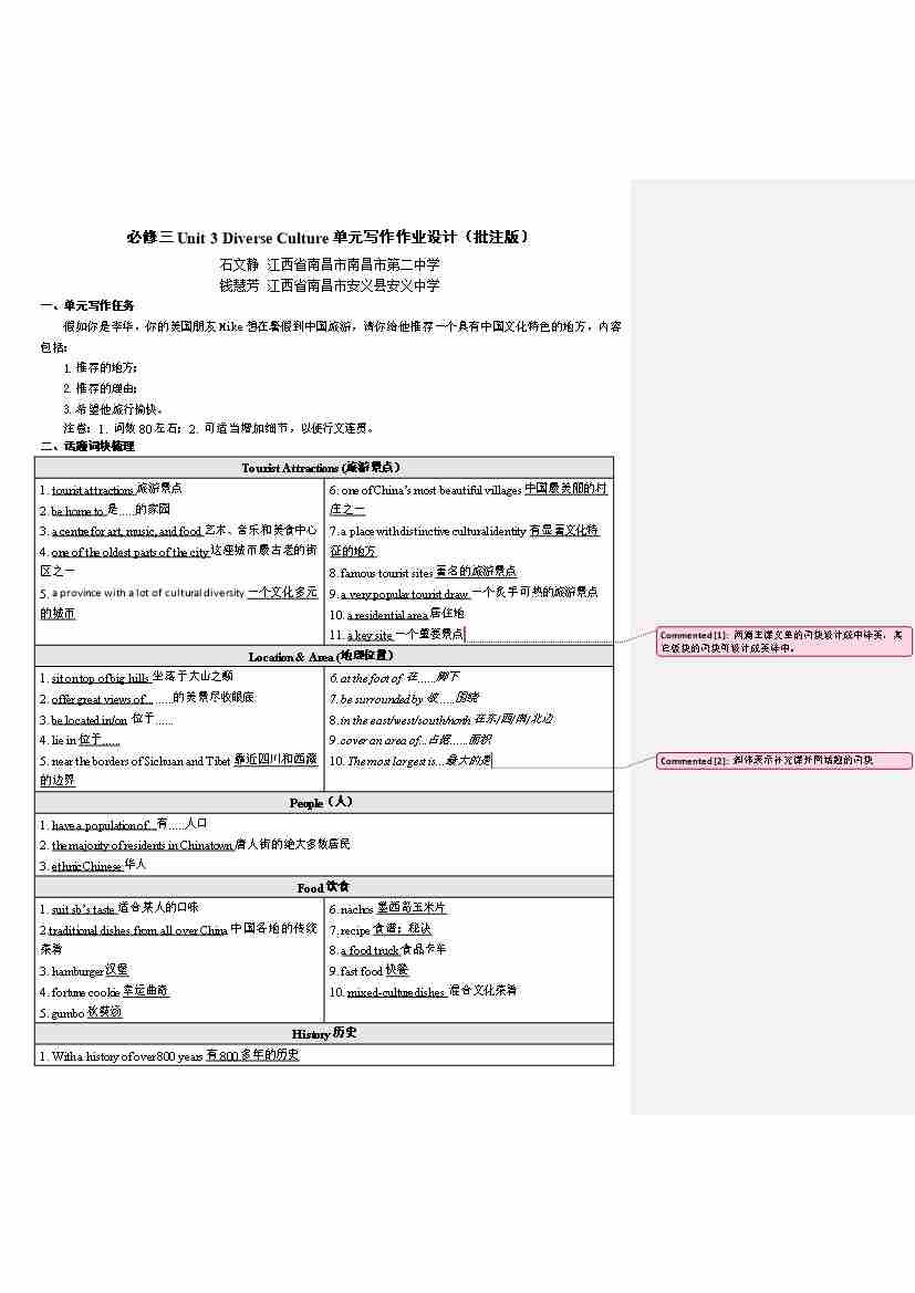 必修三Unit 3 Diverse Culture单元写作作业设计(批注版)