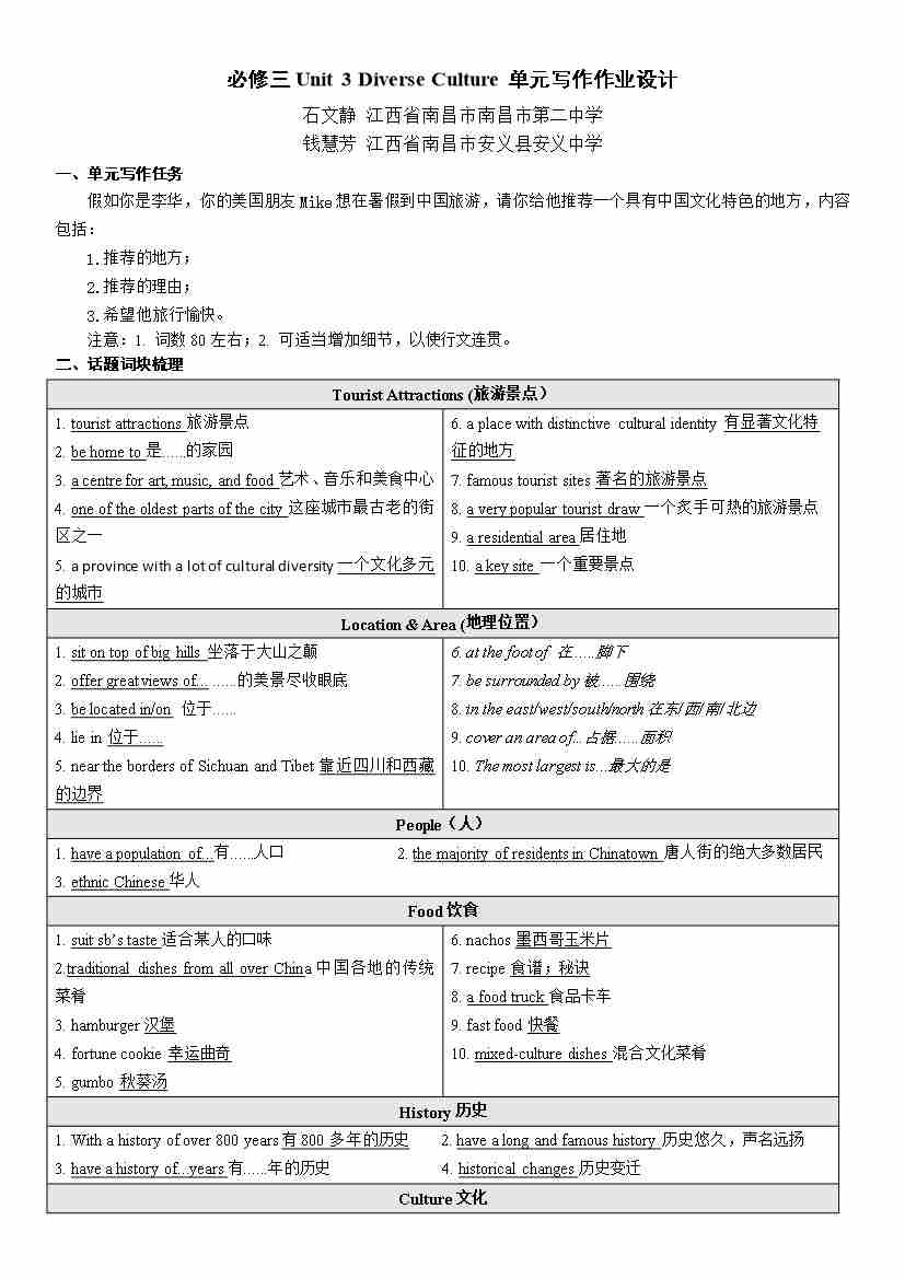 必修三Unit 3 Diverse Culture单元写作作业设计(教师版)