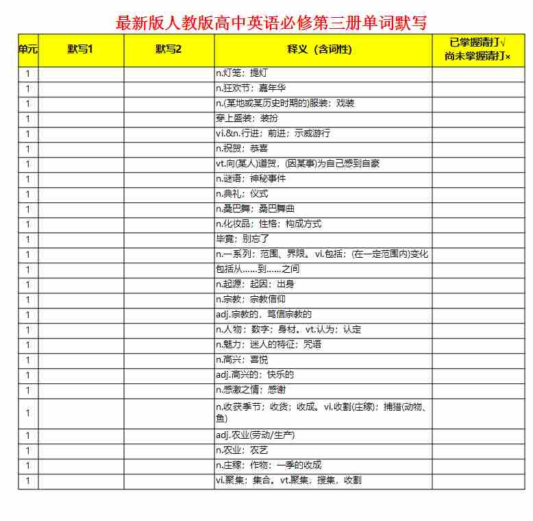 人教版高中必修第三册单词表-excel版