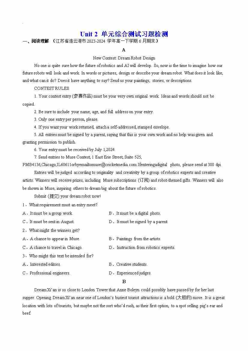 Unit 2 单元综合测试习题检测(原卷版)--- 【上好课】2024-2025学年高一英语同步精品课堂(人教版2019必修第三册)