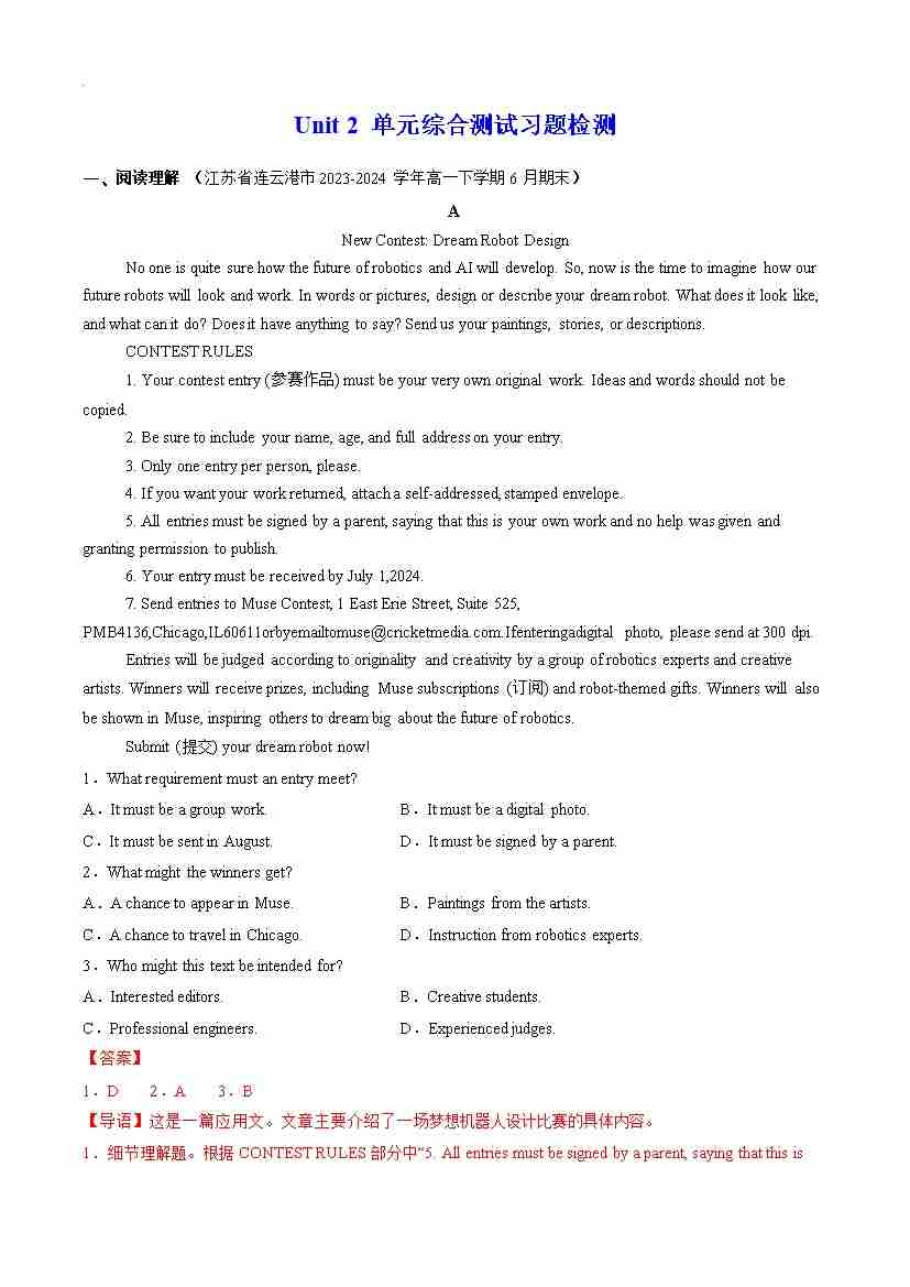 Unit 2 单元综合测试习题检测(解析版)--- 【上好课】2024-2025学年高一英语同步精品课堂(人教版2019必修第三册)