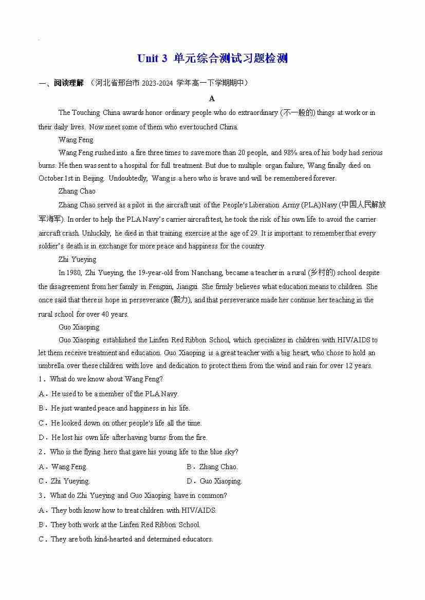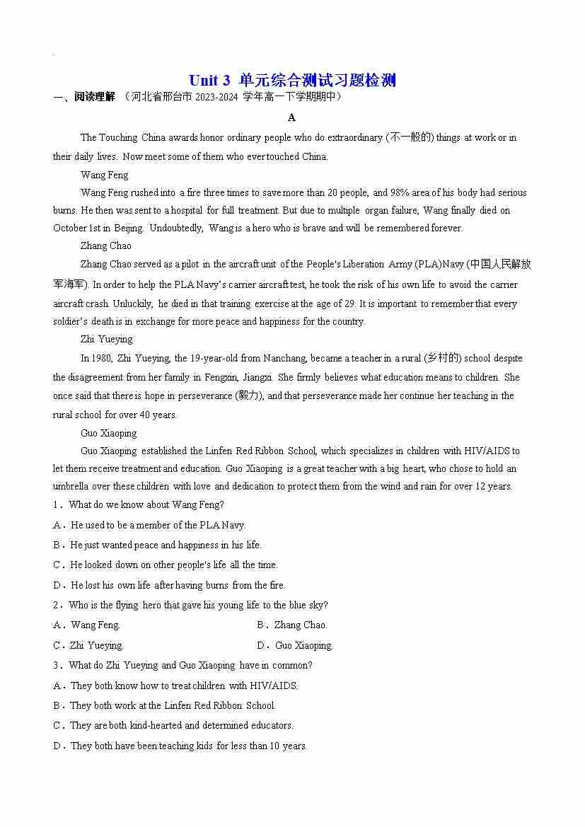 Unit 3 Reading and Thinking 分层练习(原卷版)--- 【上好课】2024-2025学年高一英语同步精品课堂(人教版2019必修第三册)