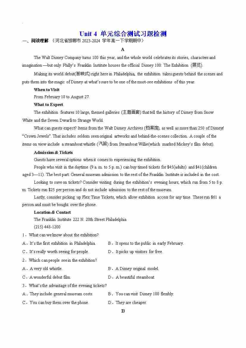 Unit 4 单元综合测试习题检测(原卷版)--- 【上好课】2024-2025学年高一英语同步精品课堂(人教版2019必修第三册)