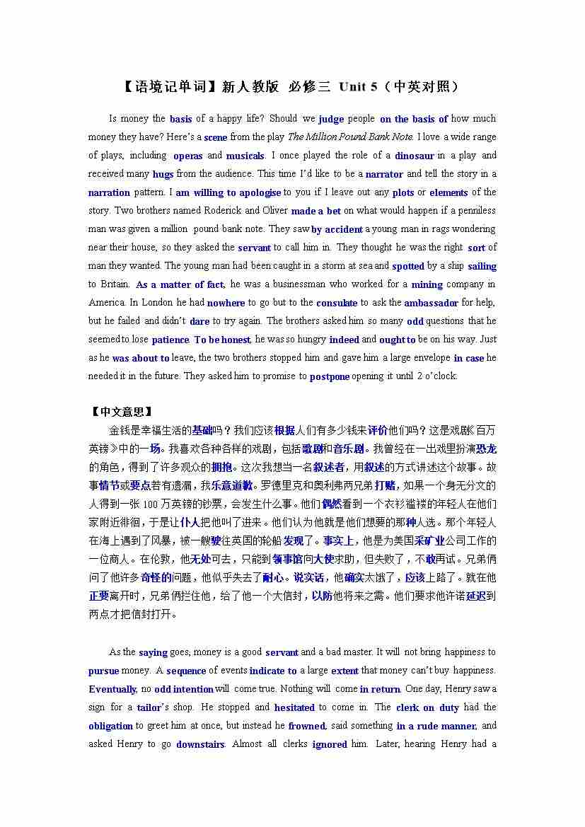 【语境记单词】新人教版 必修三 Unit 5(中英对照)