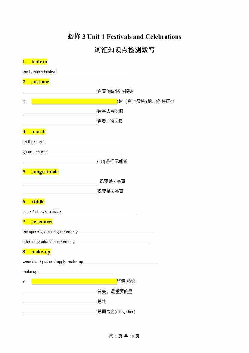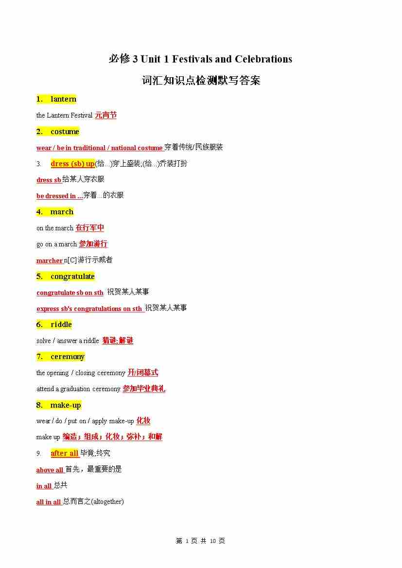 Unit 1 Festivals and Celebrations 词汇知识点检测默写答案