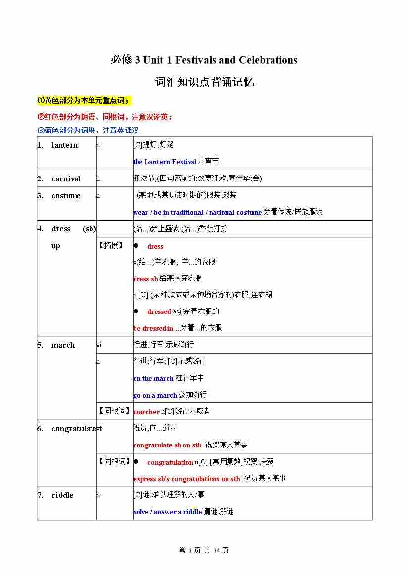 Unit 1 Festivals and Celebrations 词汇知识点背诵记忆