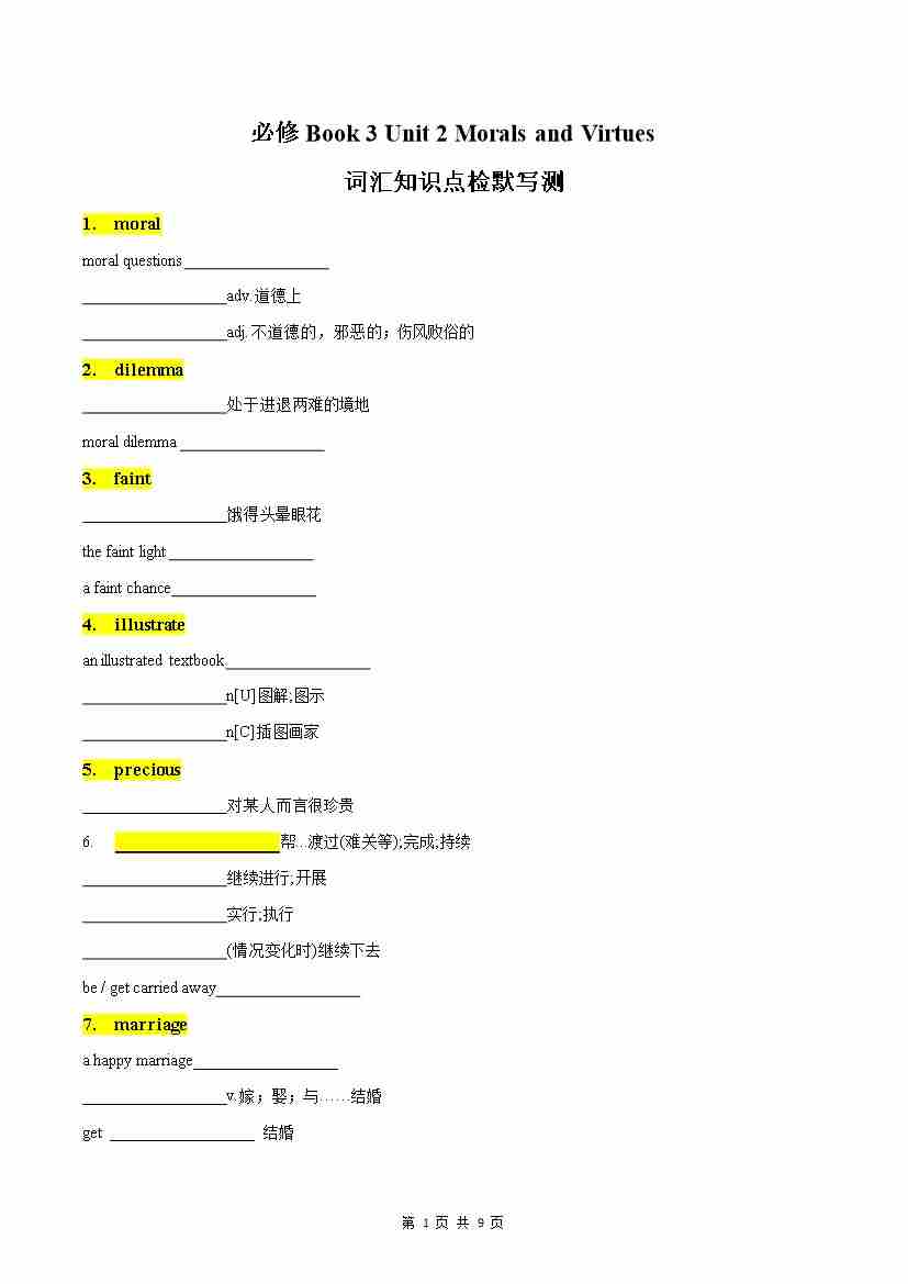 Unit 2 Morals and Virtues 词汇知识点检测默写