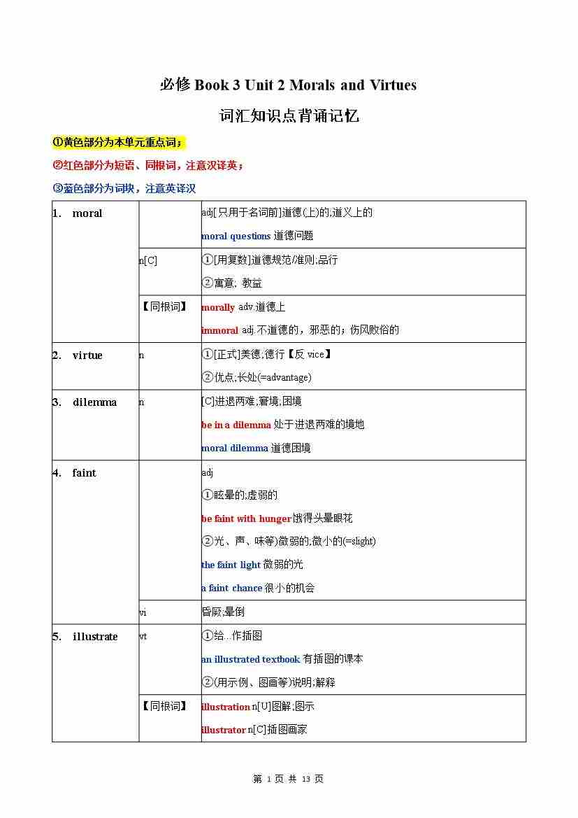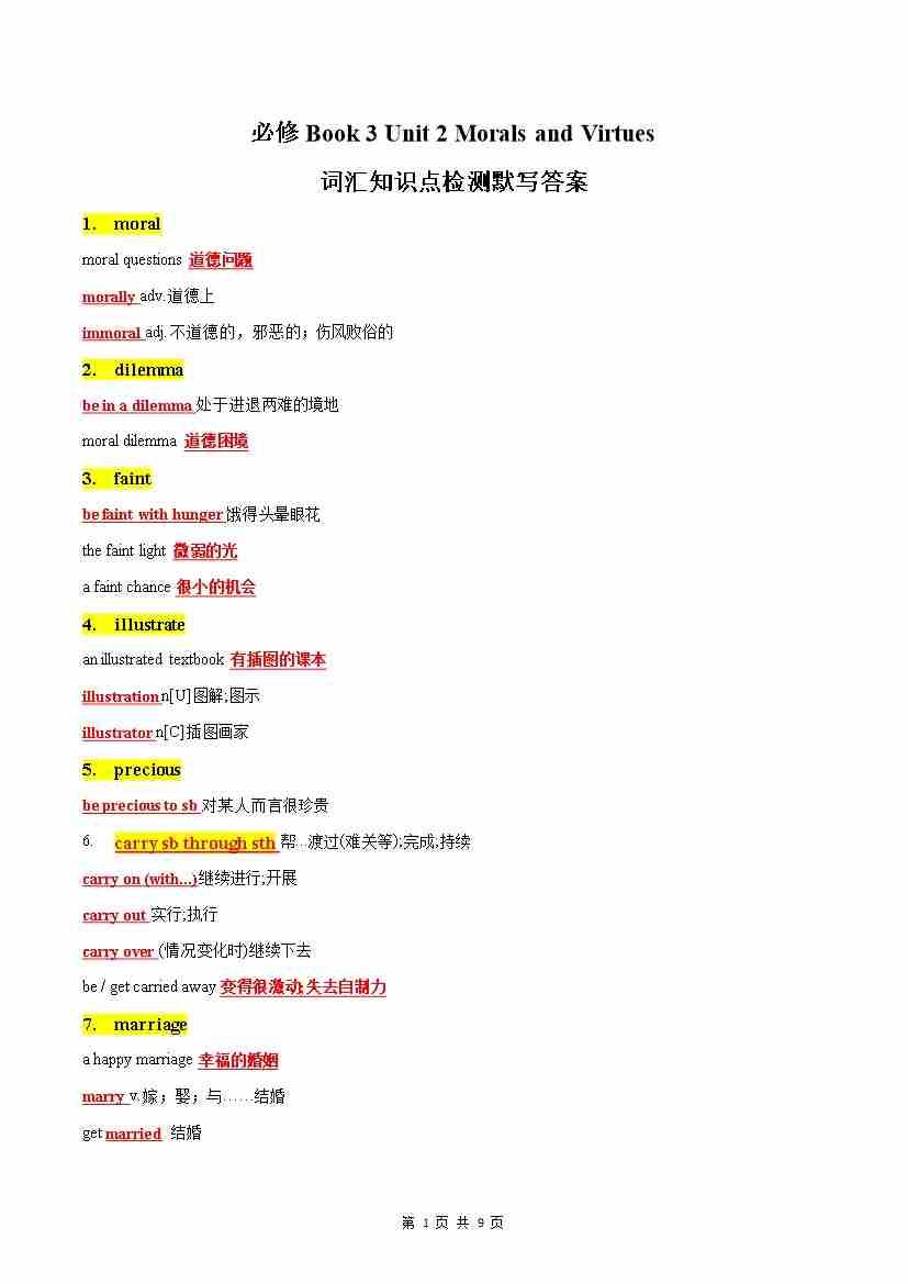Unit 2 Morals and Virtues 词汇知识点背诵记忆
