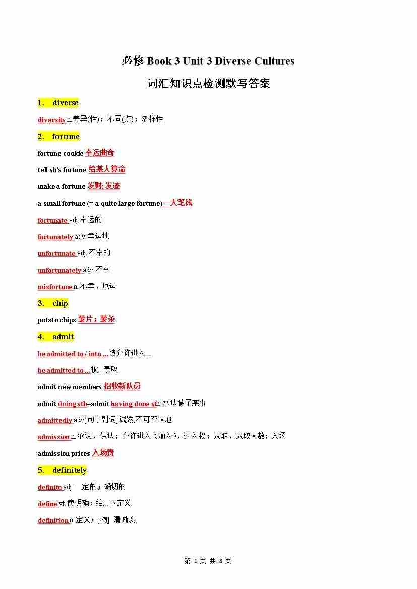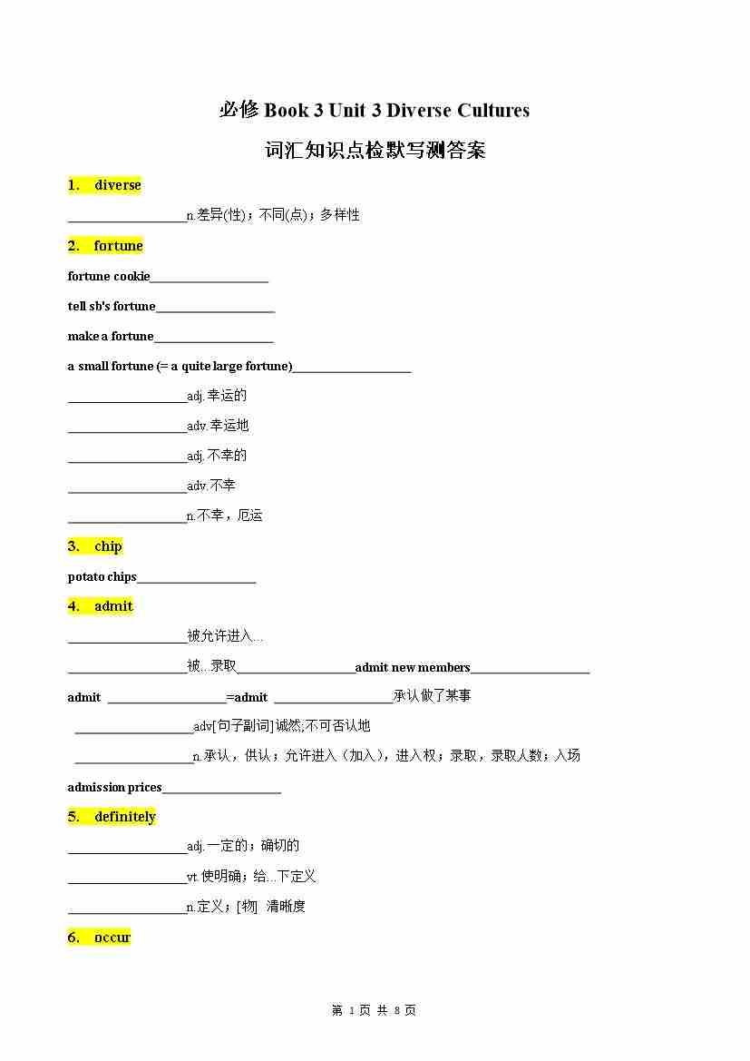 Unit 3 Diverse Cultures 词汇知识点检测默写答案