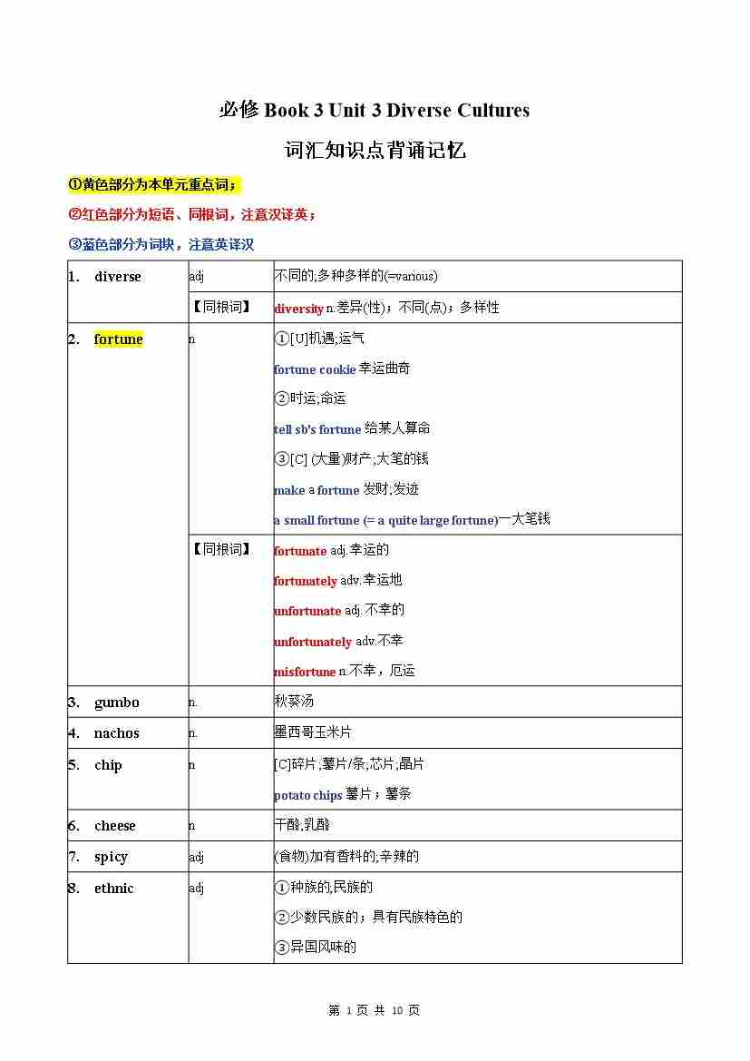 Unit 3 Diverse Cultures 词汇知识点背诵记忆