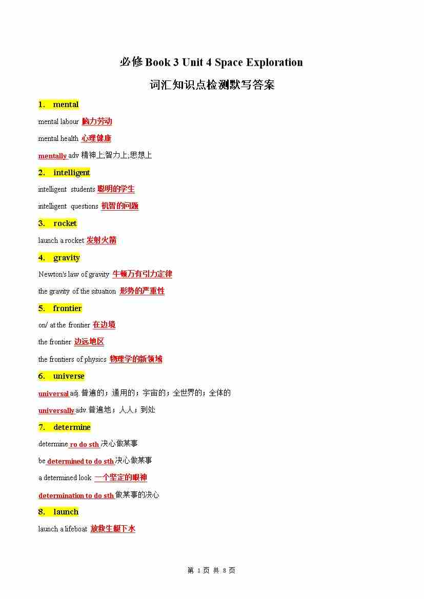 Unit 4 Space Exploration 词汇知识点检测默写答案
