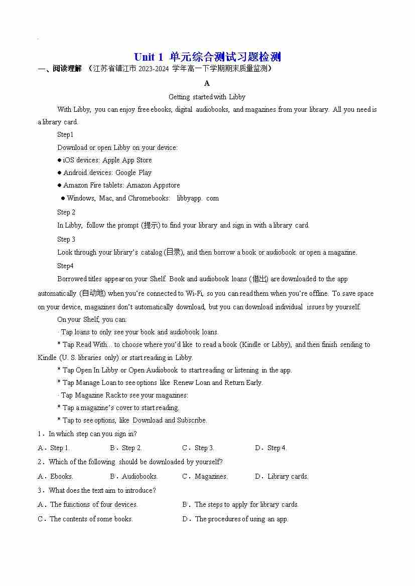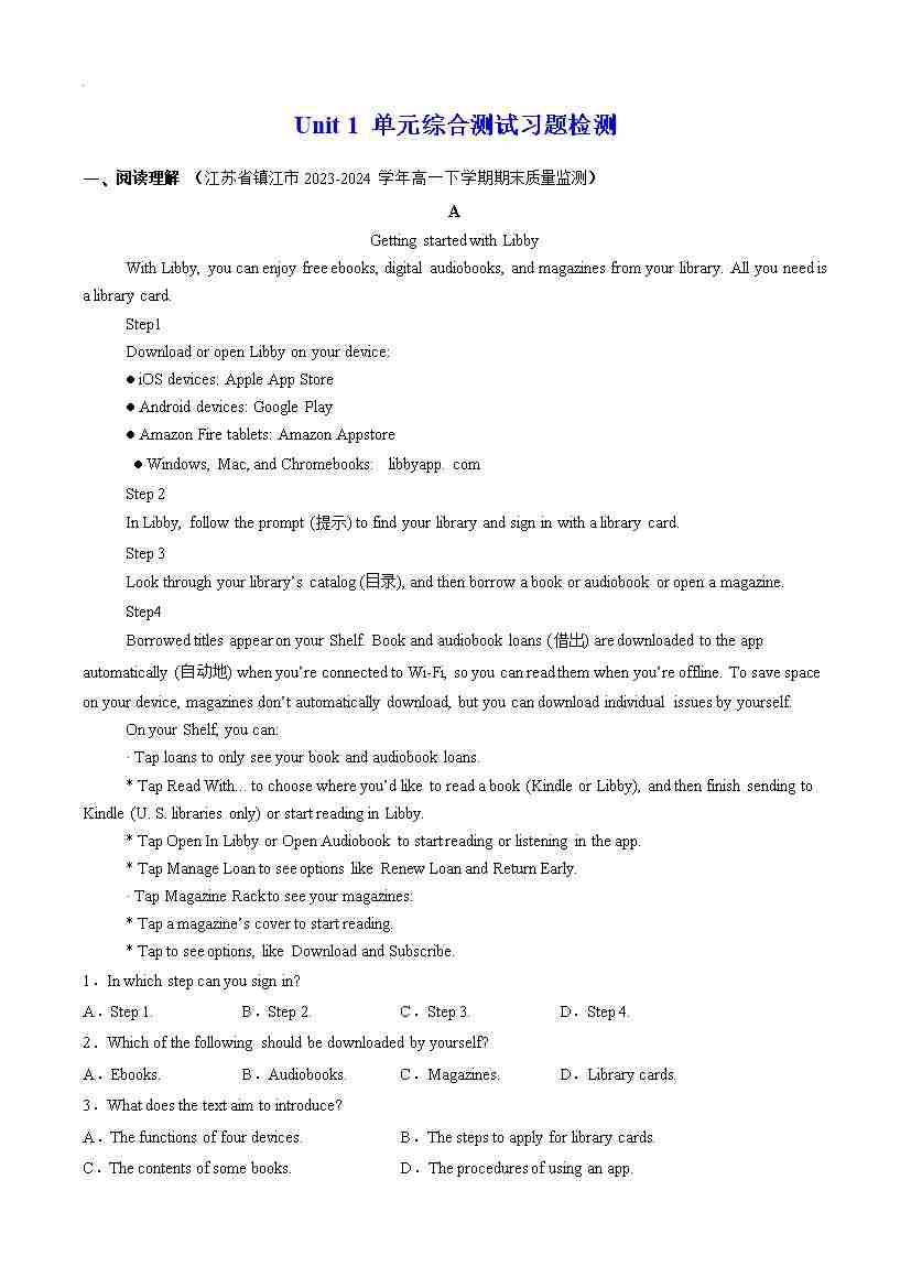 Unit 1 Reading and Thinking 分层练习(原卷版)--- 【上好课】2024-2025学年高一英语同步精品课堂(人教版2019必修第三册)