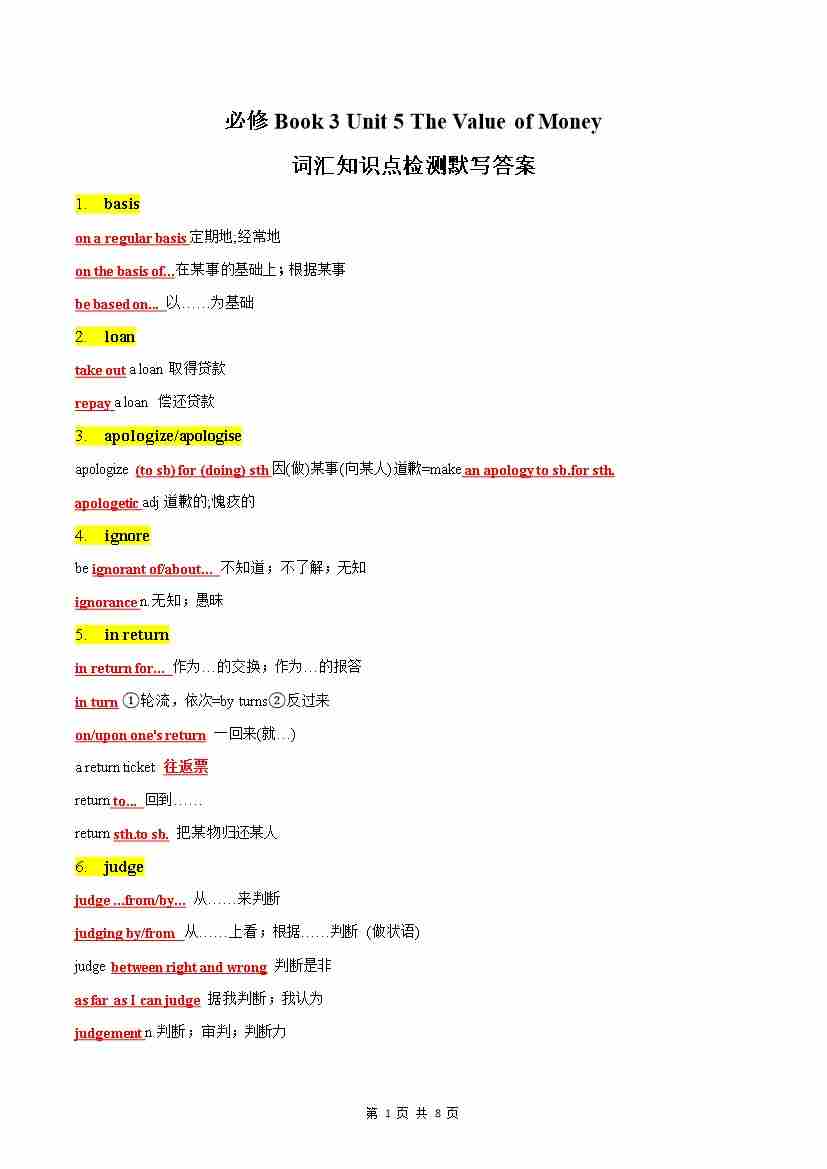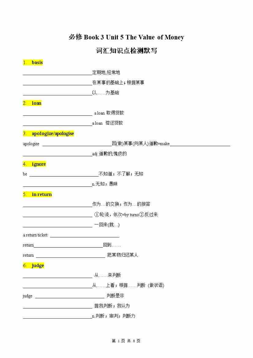 Unit 5 The Value of Money 词汇知识点检测默写答案