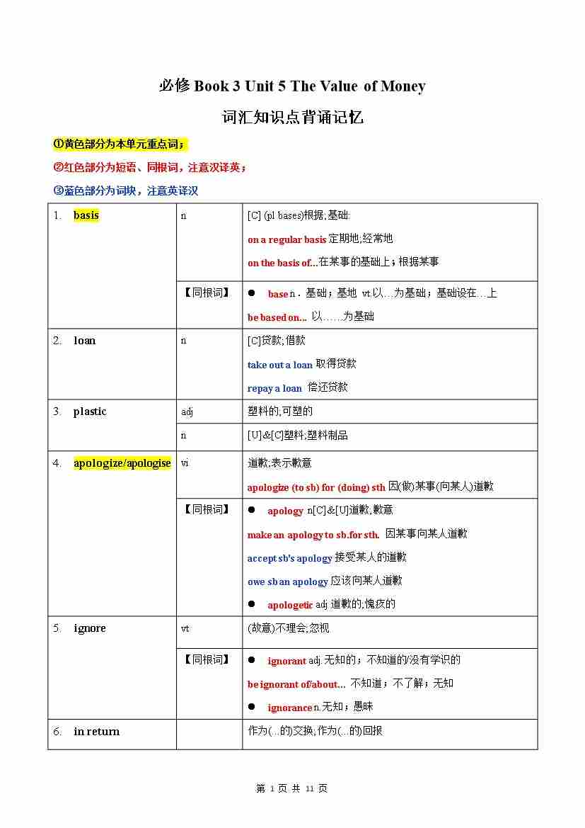 Unit 5 The Value of Money 词汇知识点背诵记忆