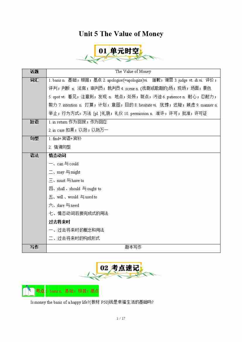 Unit 5 The Value of Money【速记清单】(解析版)